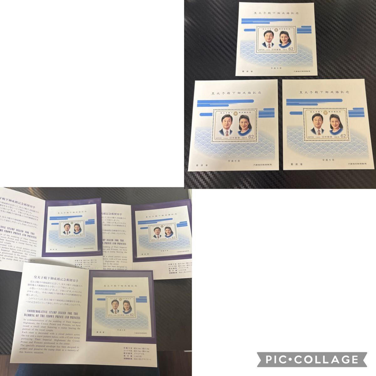 皇太子殿下(現 天皇陛下)と雅子様の御成婚を記念して発行された、額面62円の記念切手6枚セットです。特製の台紙と説明書付きで、保存状態も良好。コレクターや記念品として人気の高いお品です。額面としての使用はもちろん、コレクション・贈答用にもおすすめです。