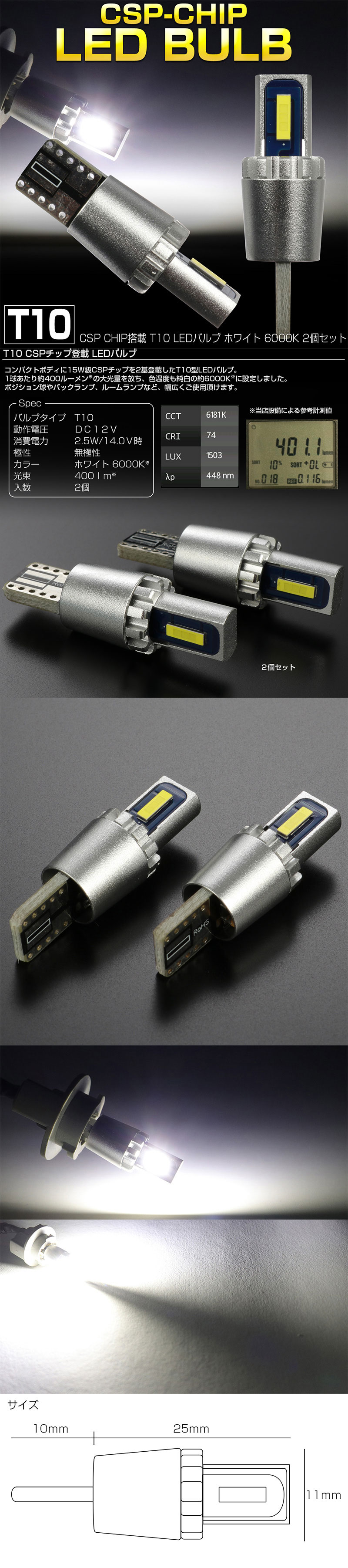 コンパクトボディに15W級CSPチップを2基登載したT10型LEDバルブ。 1球あたり約400ルーメン※の大光量を放ち、色温度も純白の約6000K※に設定しました。 ポジション球やバックランプ、ルームランプなど幅広くご使用頂けます。 ※当店設備による参考計測値 | ■バルブタイプ:T10 ■動作電圧:DC12V ■消費電力:2.5W/14.0V時 ■カラー:ホワイト 6000K ■光束:1個あたり400LM※ ■極性:無極性 ■入数:2個セット | |