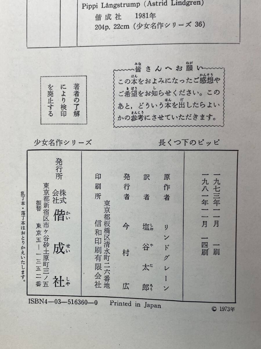 少女名作シリーズ36 長くつ下のピッピ 偕成社 童話 少女 名作4 昭和56年 1981年発行【K179405】 收藏