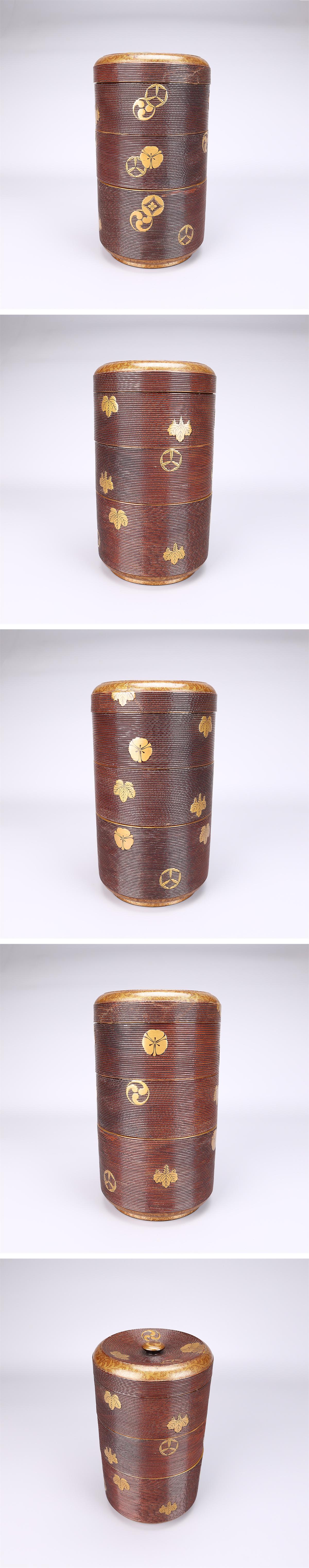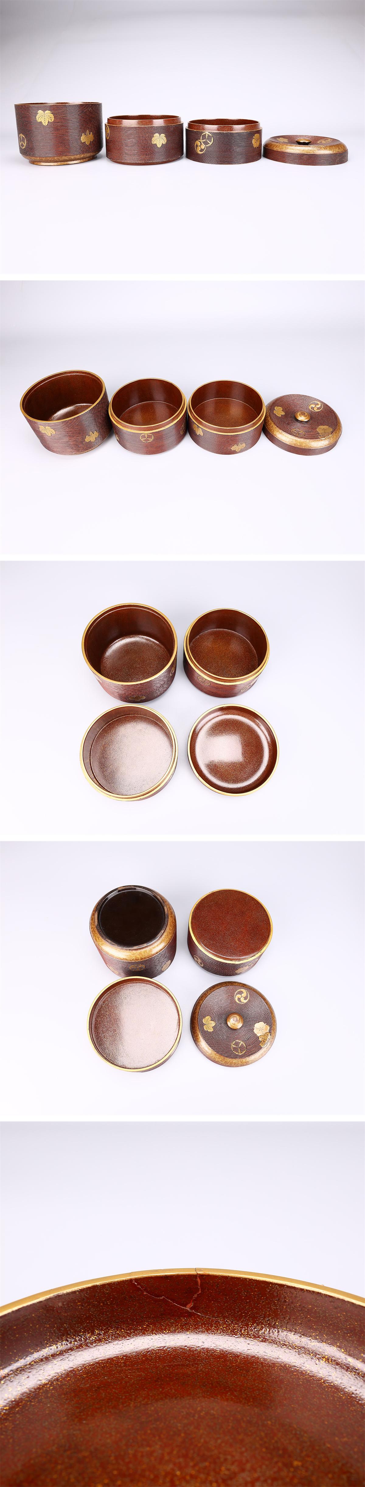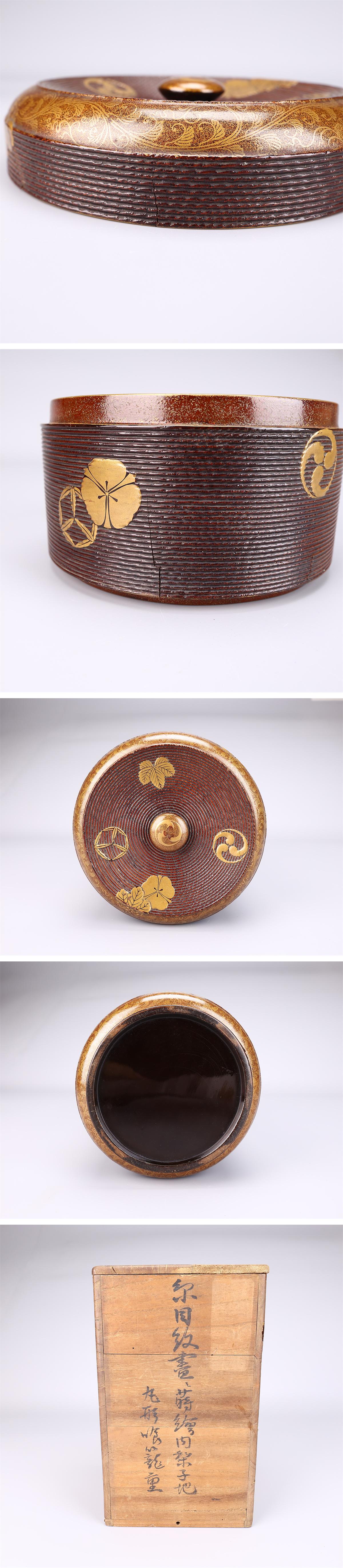 【吉】MB741 江戸時代 木製 家紋蒔絵 内梨地丸形食籠重 高24㎝ 径13.5㎝/箱付 時代のダメージありIr! 收藏