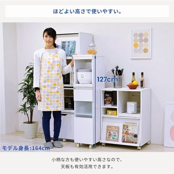 | 家電の収納に便利なコンセント付きスライド棚と、収納物に合わせて高さ調節ができる可動棚付きのラックをこれ1台で。 ハイタイプは収納量も抜群。 キッチンのちょっとした隙間に設置すれば、それまでのデッドスペースを有効活用できます。 |