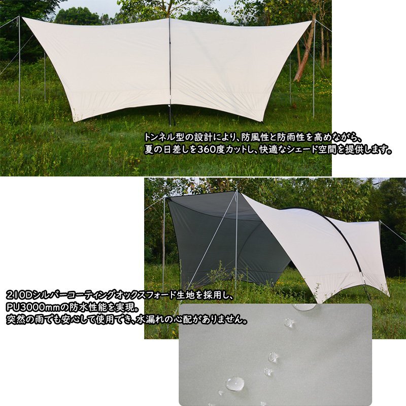【進化したトンネル型デザイン】トンネル型の設計により、防風性と防雨性を高めながら、夏の日差しを360度カットし、快適なシェード空間を提供します。広い開口部から風が通りやすく、自然な換気でタープ内の温度を快適に保ちます。8~16人がゆったり過ごせる大容量スペースと十分な高さで、家族やグループでのアウトドアにぴったりです。