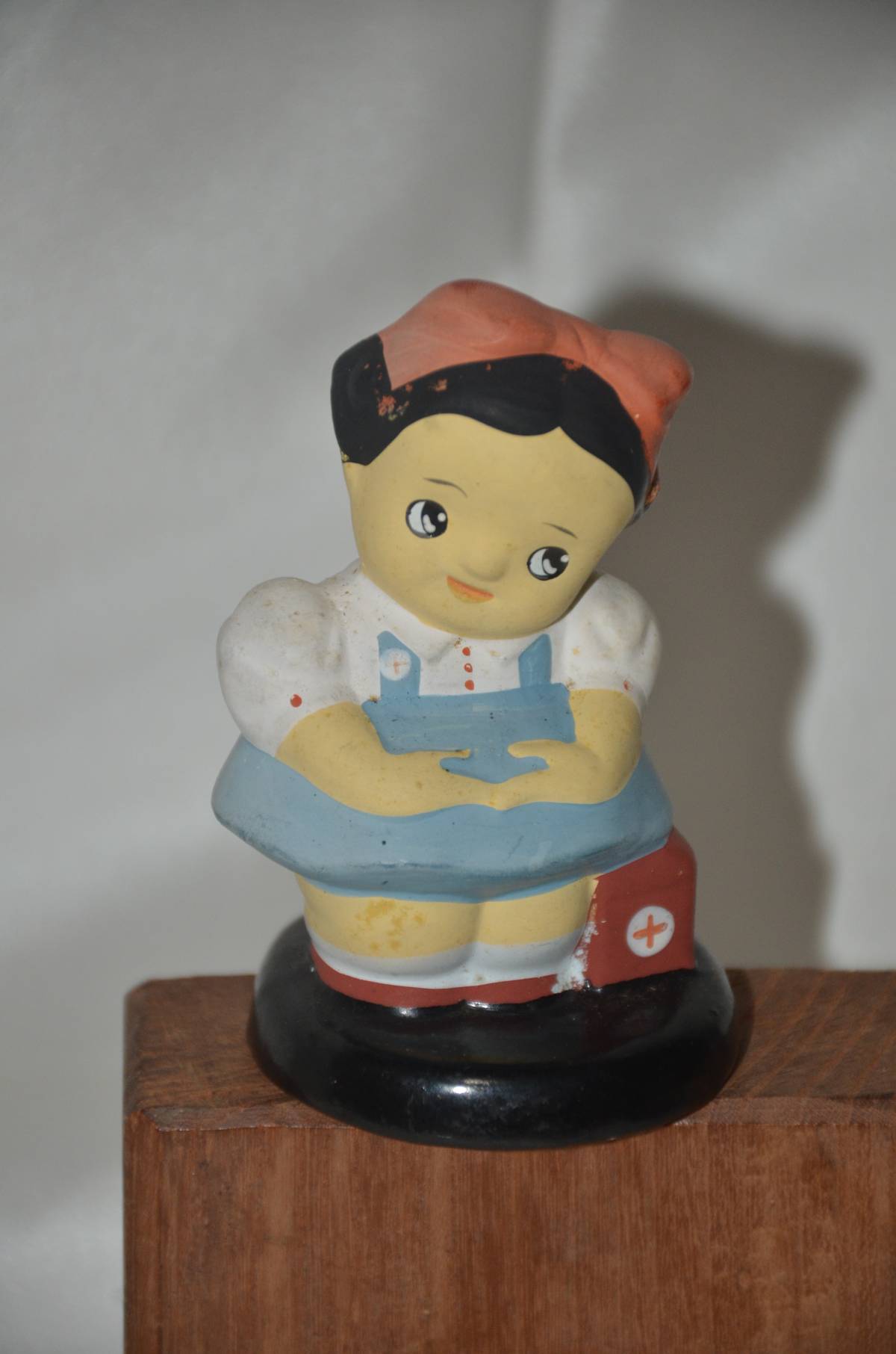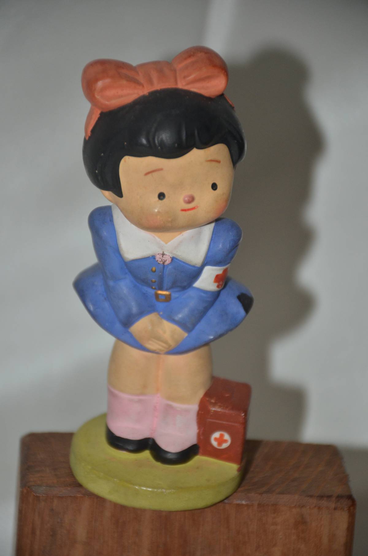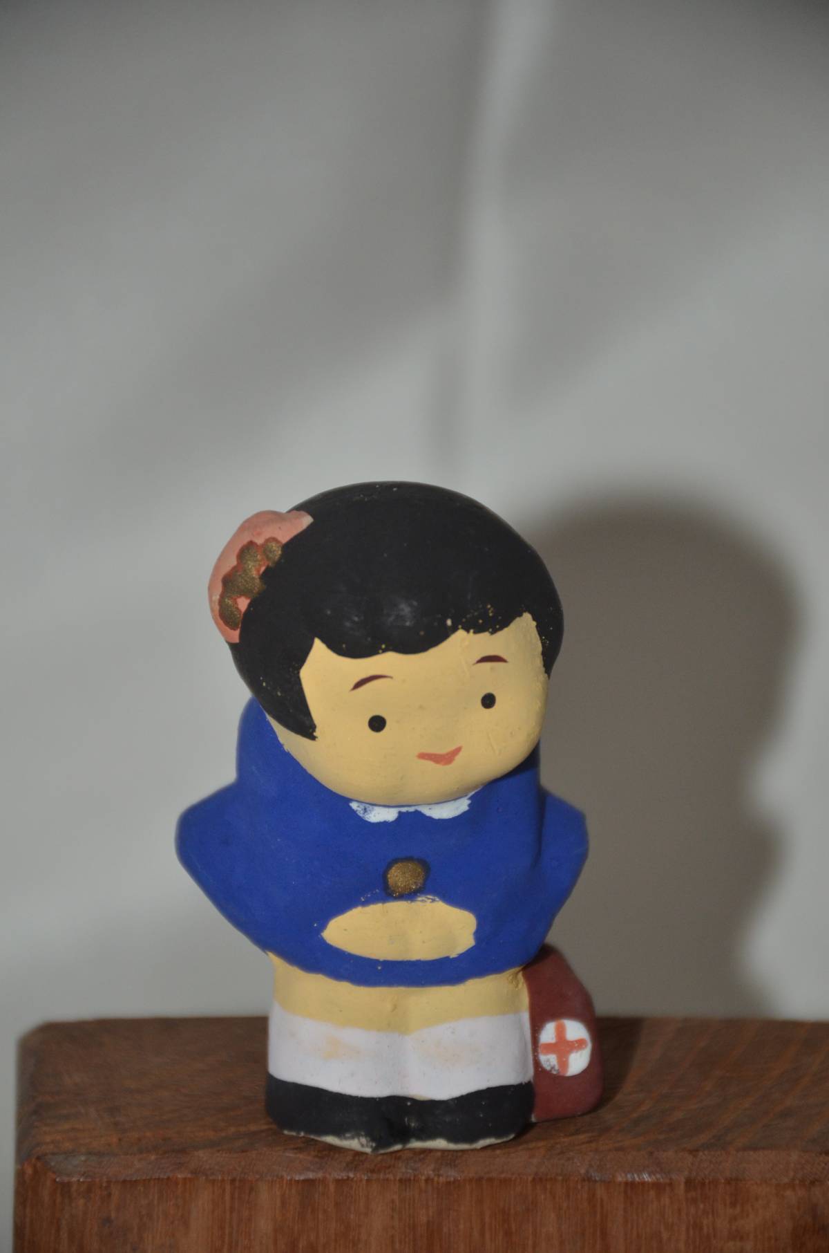 戦前の陶器製人形です。看護兵のリボンを付けた少女は、高さ12センチ、底サイズ4.8センチ×4.5センチです。スカートの看護兵の少女は、高さ9センチ、底サイズ5.5センチ×5.3センチです。櫛を付けた看護兵の少女は。高さ9センチ、底サイズ3センチ×3センチです。三点一括です。本文下の追加写真もご覧ください。ヤマト運輸宅急便で、全国一律700円でお送り致します。
