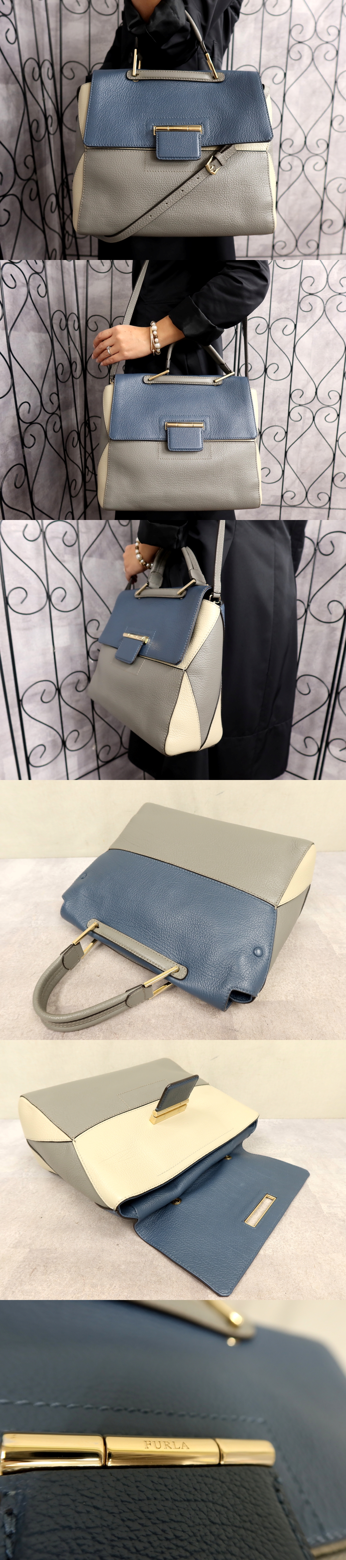 ●超美品●FURLA フルラ●アルテーシア●カーフ レザー 本革●2way ハンド バッグ●グレー アッシュブルー アイボリー●G金具●B5●Js62190 收藏