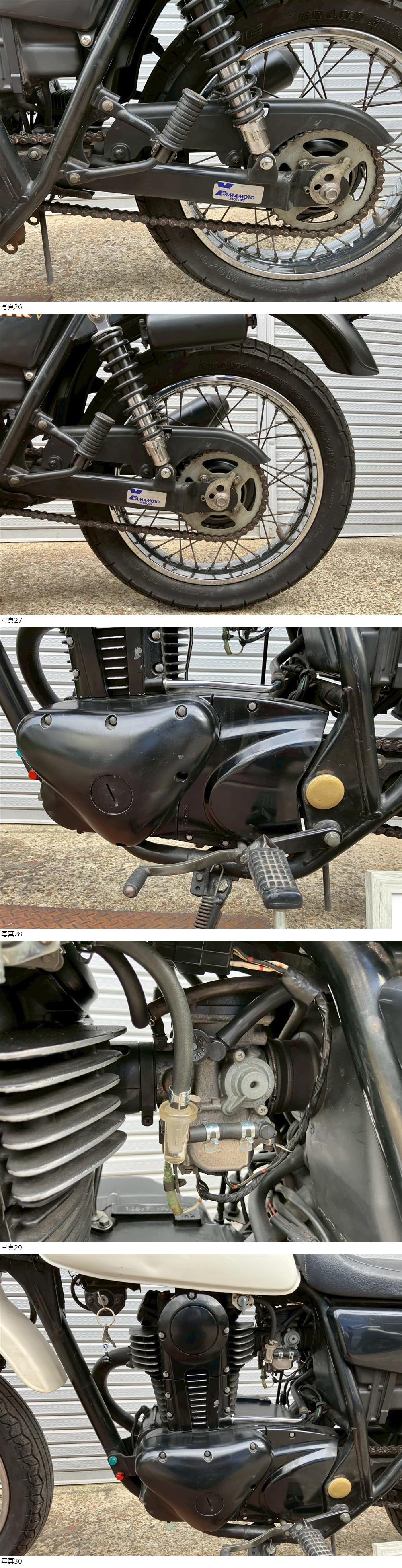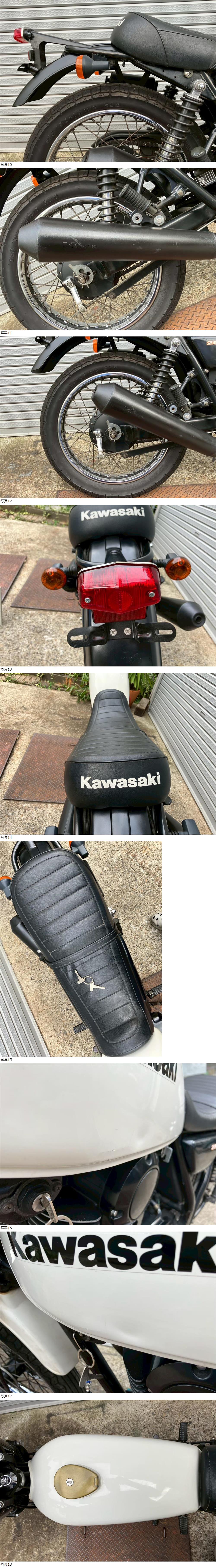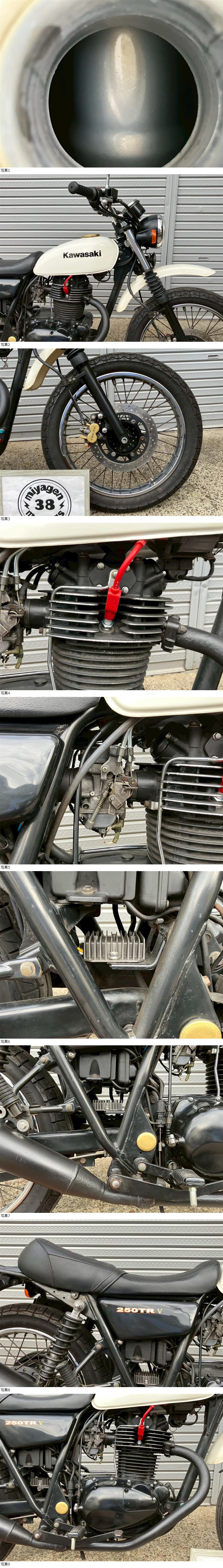 | 商品説明 | この度は当出品車両をご覧頂きまして誠に有難う御座います。 他にも複数台出品がございますので宜しければご覧ください! ご入札頂けた際には文末にありますお取引詳細にご同意頂けたものとさせて頂きます。 下記車両詳細・お取引詳細になりますので必ずご一読くださいませ! また、直接お越しいただいた方にその場で販売することもあるため予告なしに出品の取り消し等をする場合も御座います。 よって、落札前には一言コメント欄にてご一報頂けますと幸いです。予めご了承下さい。 〜〜車両詳細〜〜 メーカー:カワサキ 車種:250TR 年式:2006年式 色:白 鍵:純正キー2本 排気量:250cc 走行距離:?9,196km(走行距離疑義車) 燃料供給装置:キャブレター フレームNo:BJ250F-031XXX 街乗りスタイルがおしゃれな250TR入荷いたしました☆ ・外観 年式を考慮すると好印象な1台です。 状態は写真にてご確認ください。 ・エンジンセルにて始動O K! 吹け上がり良好! 確認箇所は以下となります。 スピードメーター:作動OK! ヘッドライト:ハイロー点灯! ウィンカー:前後左右点灯! テール:尾灯・ブレーキ共に点灯! ナンバー灯:点灯! ホーン:作動OK! 燃料計:不動 ★別途部品交換受け付けます! ・タイヤ前後交換など!詳細は直接お問い合わせくださいませ! エンジンオイル・タイヤ交換など! 詳細は直接お問い合わせくださいませ! *上記ご利用の際は部品の在庫状況によりお引き渡しまでにお時間を頂戴する場合が御座います。 〜〜お取引詳細〜〜 ※ご注意ください※ 出品車両はあくまで現状販売となります。走行点検などは行っておりません。 良好・好印象などの表記に関しても車両の状態を確実に保証するものではなく 細かい程度の差なども含めあくまで当方の主観でありますこと重々ご承知置き下さい。 特別に気になる箇所など(外観に限ります)がある場合は直接ご相談ください。 ご指定いただきました箇所のお写真を添付をさせていただきます。 (あまりにも多い場合はご対応致しかねます。) 上記を踏まえまして現車の確認は大歓迎です。 細かい箇所など気になる方は是非とも現車確認を行ってください! (予約制となりますので直接お問い合わせください。) 一般の二輪販売店と同様の点検・整備は行っておりません。 車両に関する一切の保証等も御座いませんので自走でのお引き取りはお断り致します。 ある程度の知識があり落札後にご自身で整備の出来る方、或いは整備工場等にて分解整備を別途検討できる方、メンテナンスベースとしての使用などの落札を推奨しております。 明記してあること以外の確認はしておらず、また致しかねます。 目視できる消耗品以外のパーツに関しましても寿命のわからぬものなど御座います。 (中古品ですのでつい先程まで正常に作動していたにも関わらずお受け取りの際に状態の変化などある場合も十分御座います。例・電子機器、ワイヤー類など) 再三にはなりますが如何なる場合もお引き渡し後のキャンセル・クレームはお受け致しかねます。 現状販売というものを重々ご理解の上ノークレーム・ノーリターンでよろしくお願い致します。 原則キャンセルはお受け致しかねますが、止むを得ず落札者様都合でキャンセルされる場合には 落札金額の1割をキャンセル費用として頂戴させて頂きます。 上記取引内容に不安を感じられる方には二輪販売店等の整備・保証付き車両のご購入を強くお勧め致します。 ★直接引き取り・即引き取り大歓迎! 直接引き取りの場合、落札から1週間以内にお引き取り下さい。 それ以降日割りにて2,200円を別途頂戴させて頂きます。 *部品交換をご依頼の方は完成のご連絡から1週間以内となります。 ★配送OK! 主に配送業者に委託しております。ご自身で手配いただいても結構です。 レッドラインの金額を参考にしておりますのでお手数ですが費用に関しましては落札者様にて直接HPでご確認下さい。 発送元は埼玉県川口市となります。ご購入から配送までの目安は関東近郊で1〜2週間程度となるかと思います。(地域、期間により大幅に異なりますので納期が気になる方は直接レッドラインへお問い合わせ下さい。) 関東近郊の場合割増でお早めにお届けできる場合も御座いますので一度ご相談下さいませ!(対象外となる場合も御座います。) また、配送の場合もお取置き等の対応は致しかねますので落札後は速やかに配送依頼の手続きを行わせて頂きます。 ★車両のみの販売となりますので必要な場合のみ別途5,500円にて販売証明書の発行・発送を受け賜ります! ★新規アカウントの方、落札者様の評価内容によりましては、ご入札頂いても当方の判断で削除する場合がございます。予めご了承下さい。 ★落札後、24時間以内にお客様情報のご入力・落札代金のお支払いがいただけない方のお取引はキャンセルとさせていただきます。(お支払いに関しましては、どうしてもの場合大幅な期間でなければある程度ご相談にのらせていただきます。) 予めご了承くださいま
