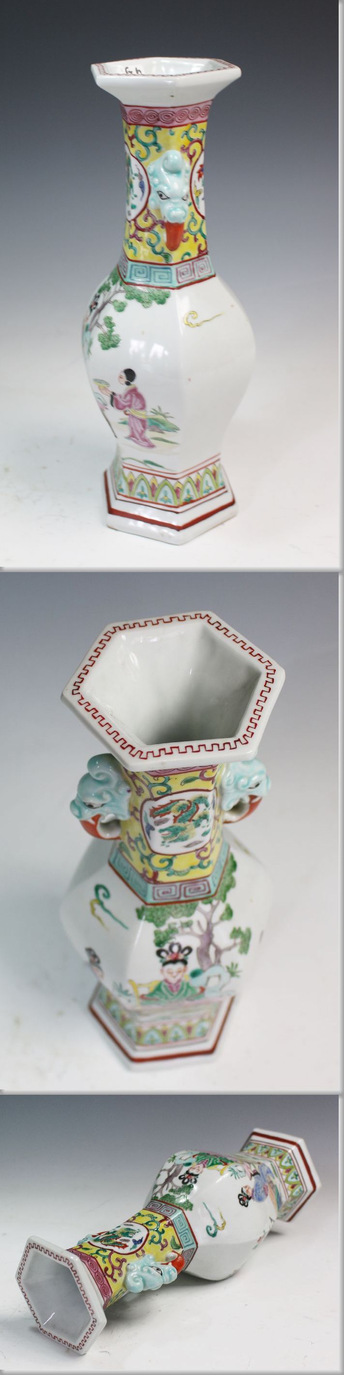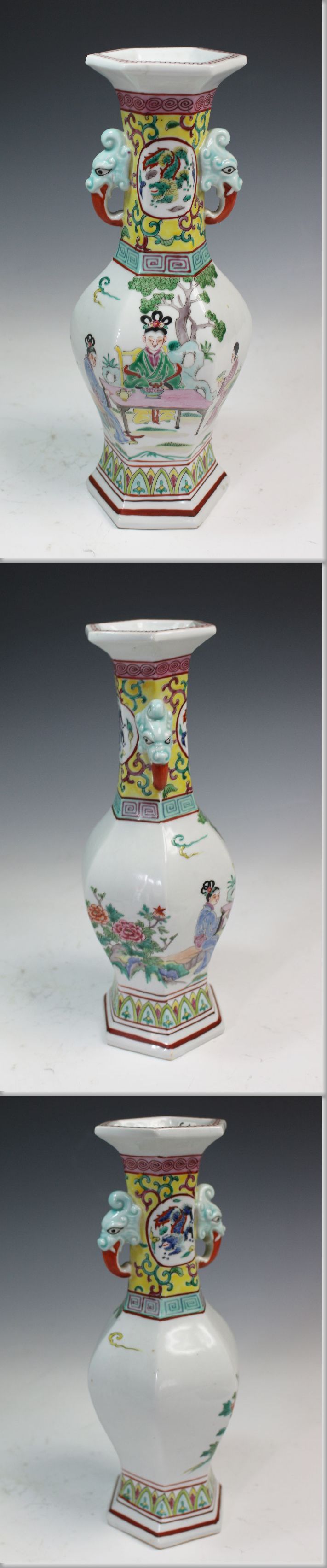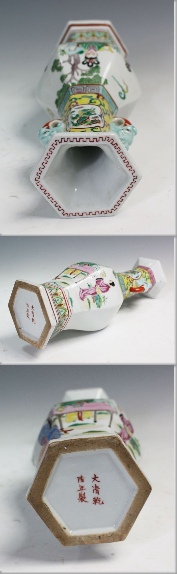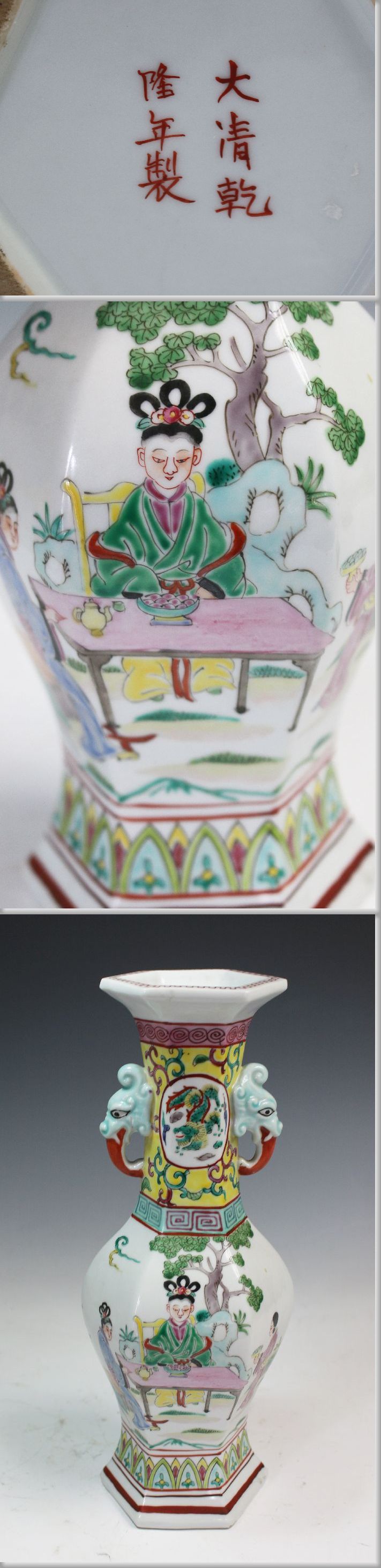 ■■ 中国美術工芸品 「大清乾隆年製」銘 五彩女人文六角面取り獣耳瓶 高さ30cm ■■