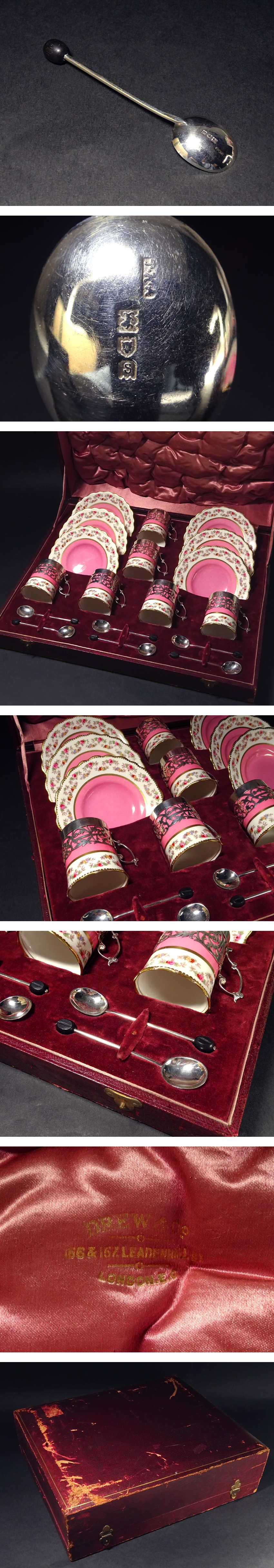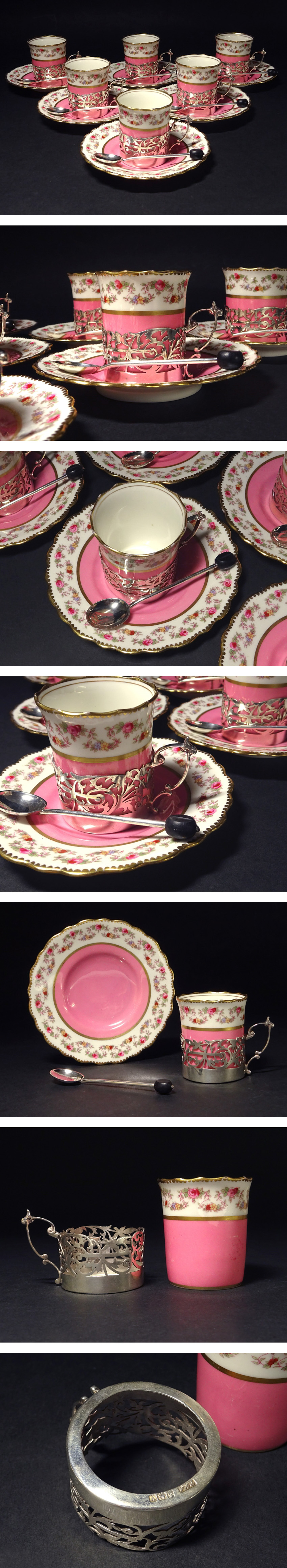 慶應◆1905-10年代頃 英国【AYNSLEY エインズレイ】ピンクフローラル デミタスカップ&ソーサー6客 銀製ホルダー・スプーン 当時箱付き 收藏