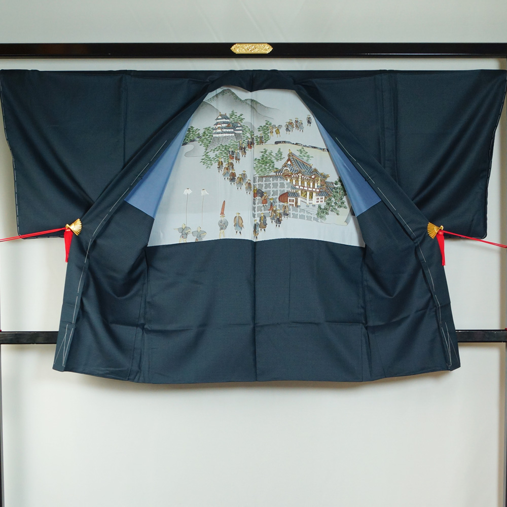 | 寸 法 | Lサイズ 裄:72cm 前幅:24.5cm 後幅:30.5cm 袖丈:49.5cm 身丈:150.5cm 羽織丈:91cm ご身長目安 172~178cm位の方向けとなります。 |