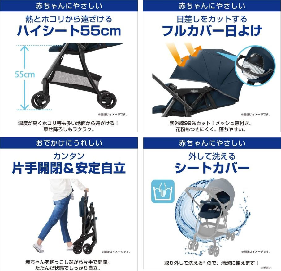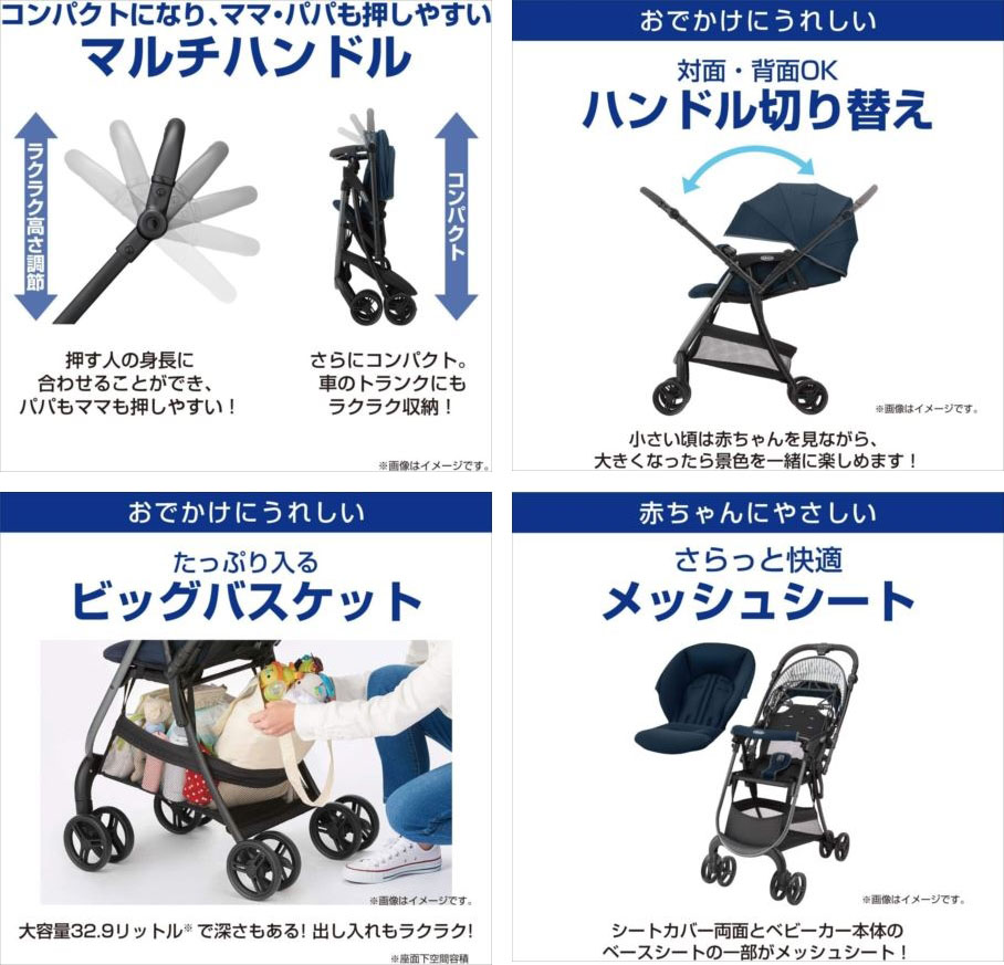 【商品特長】 ●しっかりボディで軽量4.3kg しっかり押しやすいボディ構造なのに軽量4.3kg! 階段などでの持ち運びやお子さまを抱っこしながらの移動もラクラク。 ●コンパクトにたためて、押しやすいマルチハンドル 7段階に調節できるマルチハンドル搭載。ベビーカーを折りたたんだときに、よりコンパクトになり収納にも便利。 走行時は身長などに合わせて角度を調節でき、ママもパパも押しやすい。 ●ビッグバスケット 大容量32.9L(座面下空間容積)。荷物がたっぷり入り、出し入れラクラク。 ●片手開閉&安定自立 赤ちゃんを抱っこしながら片手で開閉。たたんだ状態で自立し、収納にも便利。 ●その他にも、振動を吸収するサスペンション、対面も背面もOKなハンドル切り替え、 安心の5点式ベルト、ワンタッチで外せるフロントガードなど機能たっぷり。 | |||||||||||||||||||||||||