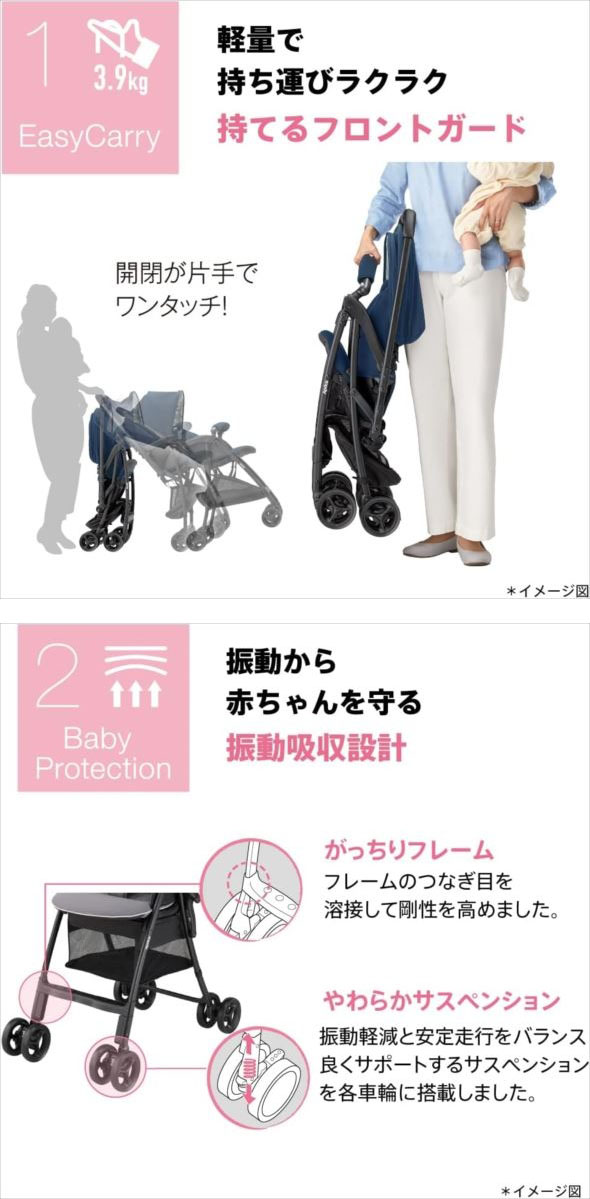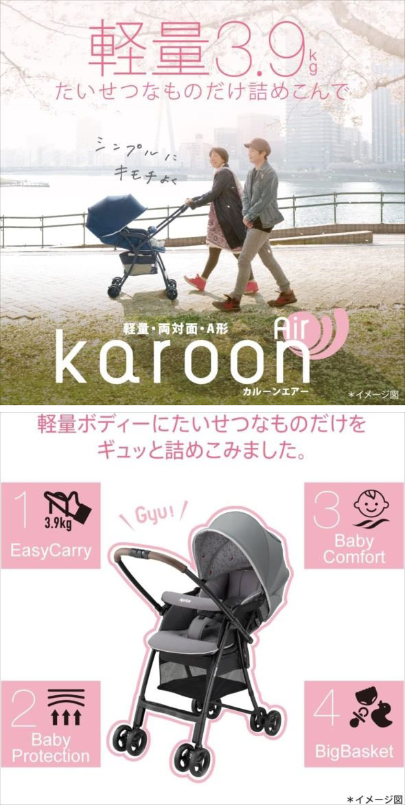 【商品特長】 ●アップリカの「カルーンエアー AD」は、軽量3.9kgの生後1カ月から3歳頃まで使える両対面・A形ベビーカー。 持ち運びラクラクの軽量ボディーに、たいせつなものだけをギュッと詰め込みました。 ●両対面ベビーカーなのに3.9kg。折りたたんでフロントガードを持てば、 階段の昇り降りや電車・バスでのお出かけもラクラクです。 ●がっちりフレームとやわらかサスペンションからなる振動吸収設計が、赤ちゃんの全身を優しく守ります。 ●熱がこもりやすい座席の背もたれに「Wサーモメディカルシステム」を採用。通気口と反射板で風を通し熱をカットします。 ●出し入れしやすい大きなバスケットを装備。荷物をしっかり収納してくれます。 ●高級感があり、お手入れしやすいレザー調ハンドルを採用。 ●その他の機能も充実。 シルキーエアー・・・通気性とクッション性を両立した素材 ワンタッチ開閉・・・折りたたみがラク、スリムに自立 ウォッシャブルシート・・・洗濯機で洗えて(※)清潔 ※液温30度を限度とし、洗濯機の弱水流で洗ってください。洗濯ネット使用、ねじり又は絞り禁止。 カプセルマルチフード・・・紫外線カット、はっ水加工 | |||||||||||||