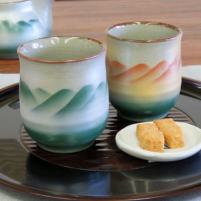 【即決】送料無料!九谷焼 夫婦湯呑み 急須 セット 連山 陶器 和食器 ペア 湯呑み茶碗 ポット 茶器 伝統工芸 美品 新品 未使用 收藏