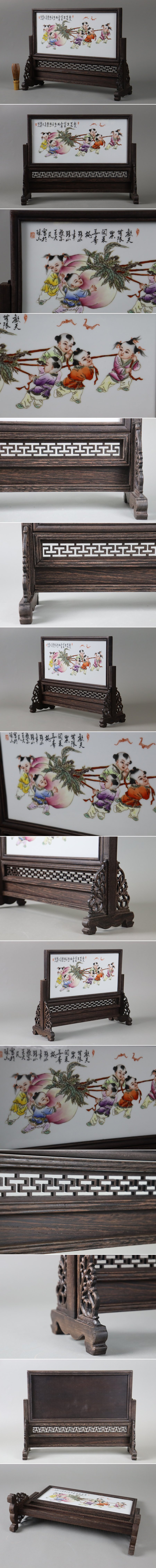 中国美術 唐木 陶板 粉彩 桃に唐子図 硯屏 幅44,5cm 唐物 煎茶飾 中国古玩 文房四宝 書道具 細密細工 古美術品[e136] 收藏