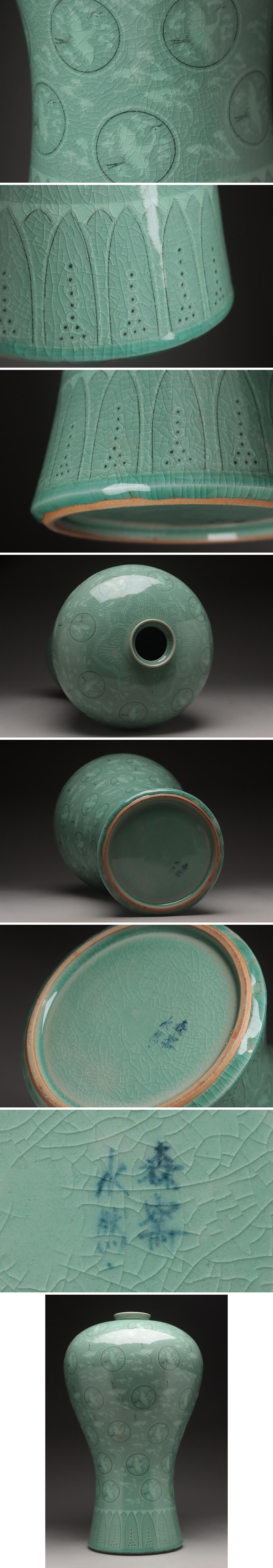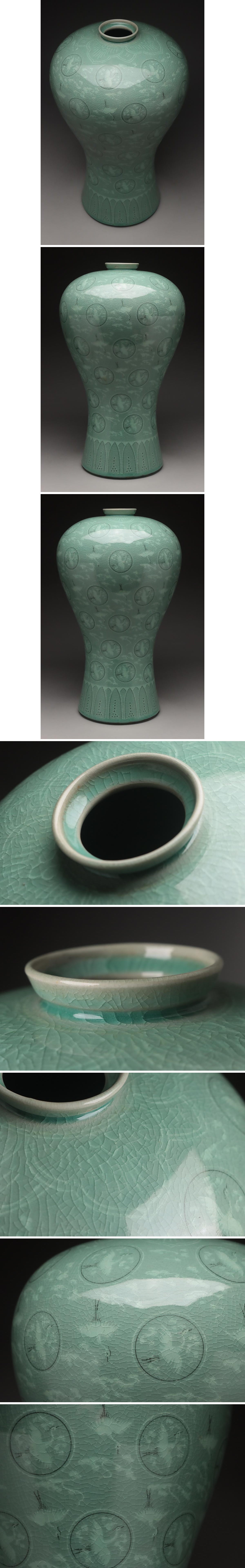 | ◆ 【韓寶蘭 作(水然)】高麗 青磁象嵌 雲鶴文 大梅瓶 高43.5cm・青磁白黒象嵌云鶴紋瓶子・花瓶 韓国陶磁器 ◆
