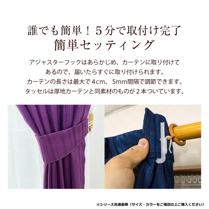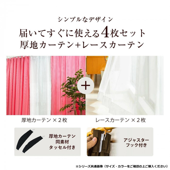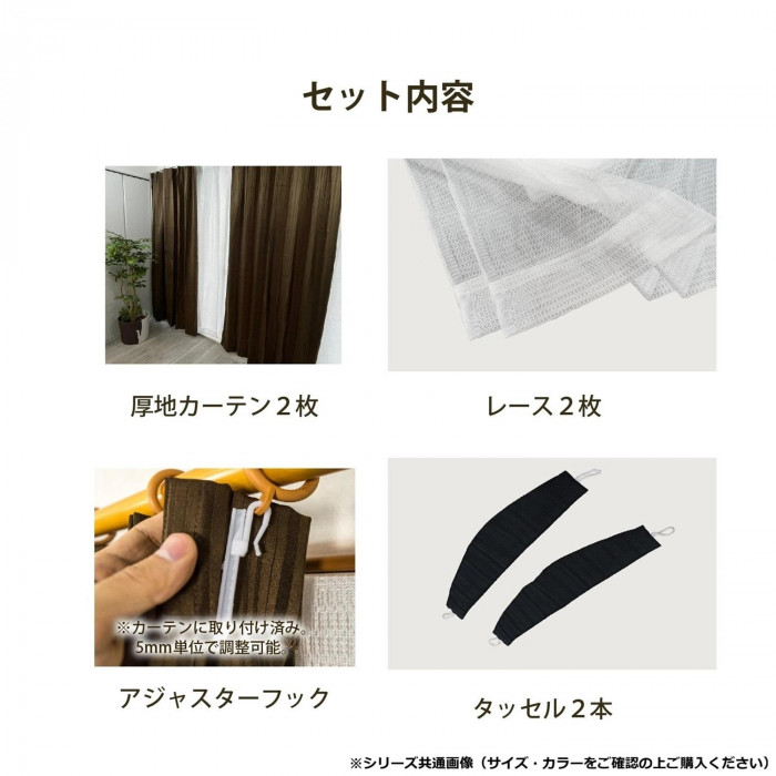 セット内容厚地カーテン2枚・レースカーテン2枚・アジャスターフック(カーテンに取付け済)・タッセル2本