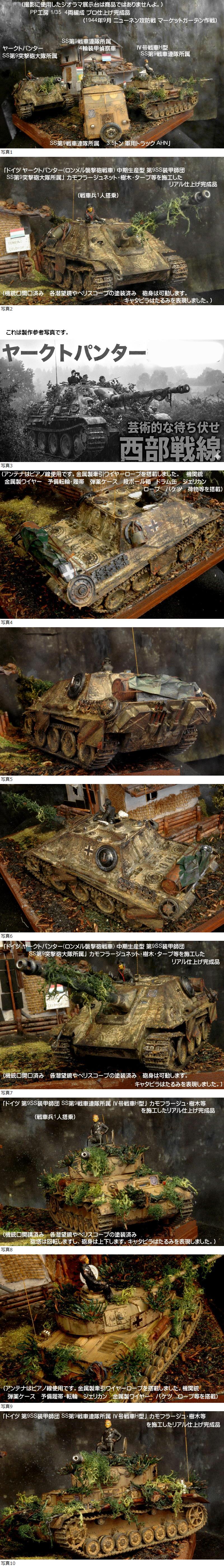 | ■今回の作品もジオラマではなく、4両編成完成品です。当店委託のプロモデラーが「ヘアスプレーチッピングやカモフラージュネット・樹木・タープ等」を施工するなどリアルに製作しており、クオリティは以下の商品説明の画像でも確認して下さいね。(撮影に使用したジオラマ展示台は、商品ではありませんよ。) ①1/35 「ドイツ ヤークトパンター(ロンメル襲撃砲戦車) 中期生産型 第9SS装甲師団 SS第9突撃砲大隊所属」 カモフラージュネット・樹木・タープ等を施工したリアル仕上げ完成品 (アンテナはピアノ線使用です。金属製牽引ワイヤーロープを搭載しました。機関銃 金属製ワイヤー 予備転輪・履帯 弾薬ケース 段ボール箱 ドラム缶 ジェリカン ロープ バケツ 荷物 など多数の装備品を搭載しました。) ドイツ戦車兵1人を搭乗させました。 ②1/35 「ドイツ Ⅳ号戦車H型 第9SS装甲師団 SS第9戦車連隊所属」 カモフラージュ・樹木等を施工したリアル仕上げ完成品 (アンテナはピアノ線使用です。金属製牽引ワイヤーロープを搭載しました。機関銃 弾薬ケース 予備履帯・転輪 ジェリカン 金属製ワイヤー バケツ ロープ スコップ 水筒 丸太等を搭載しました。)ドイツ戦車兵1人を配置しました。 ③1/35 「ドイツ 第9SS装甲師団 SS第9戦車連隊所属 3.5トン 軍用トラック AHN」 リアル仕上げ完成品 (機関銃 金属製ワイヤー バケツ ロープ スコップ 水筒 渡し板等を搭載しました。)ドイツ兵1人を配置しました。 ④1/35 「ドイツ 第9SS装甲師団 SS第9戦車連隊所属 4輪装甲偵察車 Sd.Kfz.222」 リアル仕上げ完成品 (アンテナはピアノ線使用です。ジェリカン 金属製ワイヤー バケツ ロープ スコップ 水筒等を搭載しました。)ドイツ兵1人を配置しました。 ■緻密で繊細に製作しており、とても精度の高い作品ですが、史実に忠実に表現したわけではありませんよ。ドイツ占領下のオランダ ニューネン攻防戦を想定しました。(1944年9月 マーケット・ガーデン作戦では、ニューネン近郊にドイツ第9SS装甲師団などが一時駐留していたという不運も重なり、イギリス第1空挺師団が壊滅するなど連合軍が敗退しております。) ■ヤフー画像検索で「PP工房完成品」と検索いただければ、当店の最近の作品の画像を見ることができますので、そちらも見ていただければ幸いです。・・・PP工房完成品 ★使用パーツなど(以下の作品がすべて付いてきますよ。) 1 1/35 タミヤ ヤークトパンサー(ロンメル襲撃砲戦車)(機銃口開口済み 各潜望鏡やペリスコープの塗装済み 砲身は可動します。キャタピラはたるみを表現しました。モーターライズをディスプレイタイプに改修しました。)戦車兵1人を配置しました。 2 1/35 タミヤ Ⅳ号戦車H型(機銃口開講済み 各潜望鏡やペリスコープの塗装済み 砲塔は回転しますし、砲身は上下します。キャタピラはたるみを表現しました。)戦車兵1人を配置しました。 3 1/35 タミヤ 3.5トン 軍用トラック AHN(機銃口開口済み 機銃は可動します。)ドイツ兵1人を配置しました。 4 1/35 タミヤ 4輪装甲偵察車 Sd.Kfz.222(機銃口開講済み ペリスコープの塗装済み 砲塔は回転しますし、砲身は上下します。)ドイツ兵1人を配置しました。 5 金属製ネームプレート板「ヤークトパンター」を配置しました。 ■当店(PP工房)では、プラモ完成品を週3回位の割合で出品しておりますので、よろしくおねがいしますね。 | |