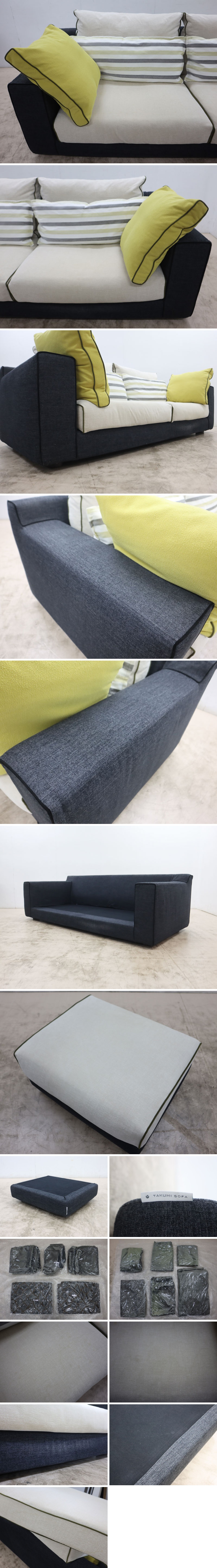 【仕様】 デザイナー:岩倉榮利 サイズ:約 W217×D96×H83cm、背クッションなしのH67cm、 SH36・AH57.5cm、オットマン/約 W72×D64×H35.5 ※実寸の為、多少の誤差はご了承下さい。 ソファカバー仕様:フルカバーリング 張地:ファブリック カラー:ネイビー×ベージュ×イエロー×縞模様系、替えカバー/ダークグリーン×ブラウン模様有系(画像では100%正確では御座いませんので気になる方は世田谷区船橋の倉庫でご覧頂けます。色味による返品、返金は一切お受けできませんのでご了承の上ご入札ください。) 合計参考価格:1,262,000 円(ソファ本体/778,000 円、オットマン/178,000 円、替えカバー/306,000 円) |