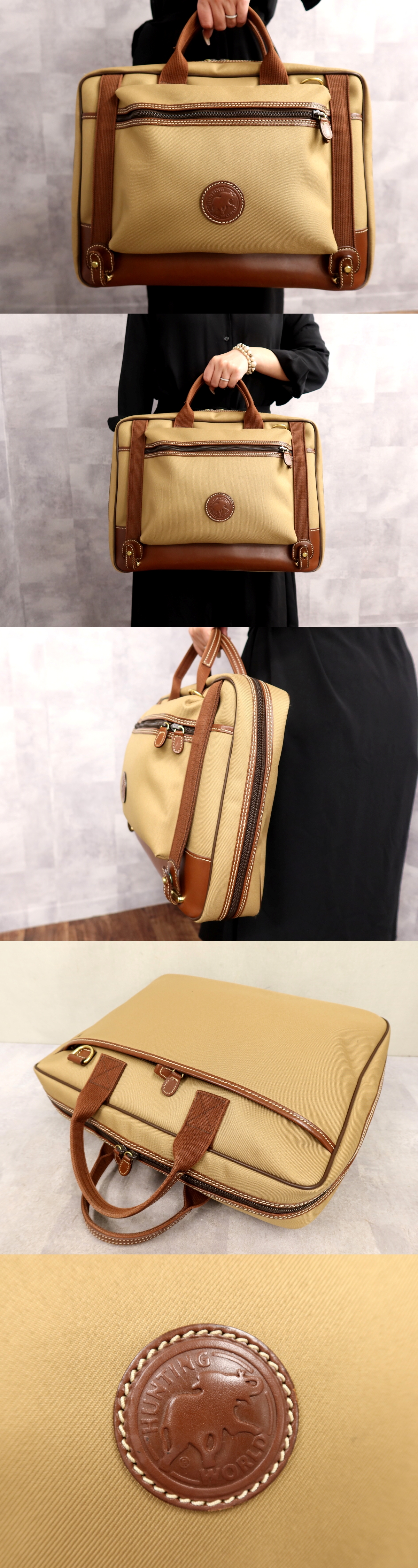 ●超美品●ハンティング・ワールド●メンズ●サファリ●キャンバス カーフ レザー 本革●ハンド ビジネス バッグ●茶系●A4 書類●Js66945 收藏