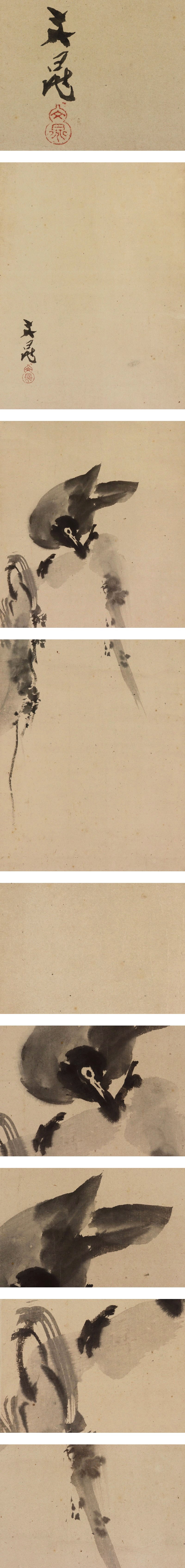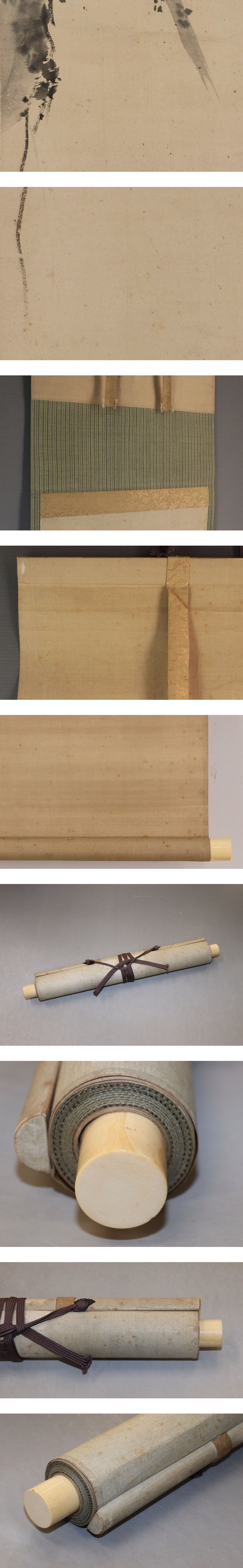 谷文晁 たに-ぶんちょう(1763-1841) 江戸時代後期の画家。 宝暦13年9月9日生まれ。谷麓谷の長男。加藤文麗,渡辺玄対らに師事。 狩野派,土佐派,南宗画,北宗画,西洋画などの手法を取り入れて独自の画風を創出, 江戸文人画壇の重鎮となる。田安徳川家に仕え,松平定信編「集古十種」の挿絵も描く。 渡辺崋山ら門人多数。天保11年12月14日死去。78歳。江戸出身。 通称は文五郎。別号に写山楼,画学斎など。 本紙は、染み、汚れ、折れ、皺、ヤケがあります。 表装は、染み、汚れ、折れ、皺、虫食、破れ、ほつれ、くすみがあります。 【サイズ】 作品 横約29.5cm×縦約108.5cm 表装 横約32.5cm×縦約194.5cm |