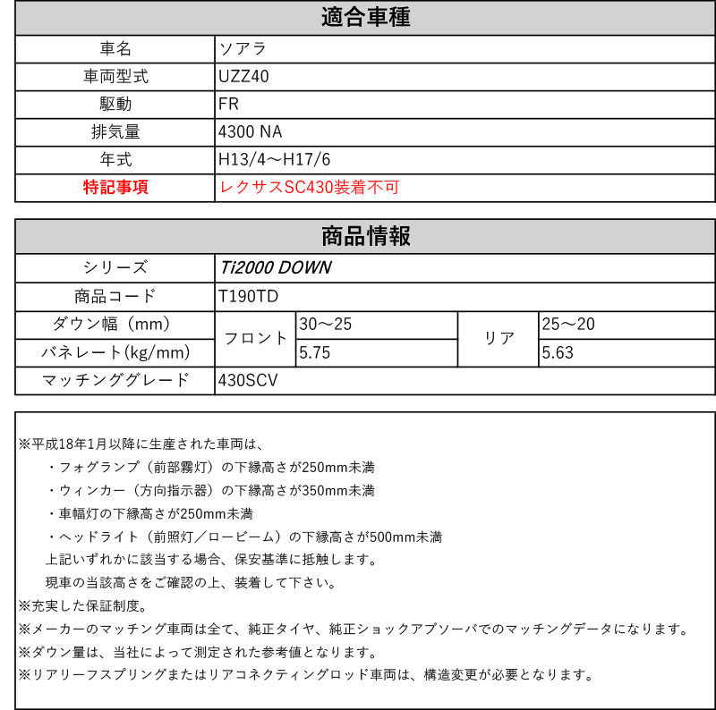 [RS-R_Ti2000 DOWN]UZZ40 ソアラ_430SCV(2WD_4300 NA_H13/4~H17/6)用車検対応ダウンサス[T190TD] 收藏