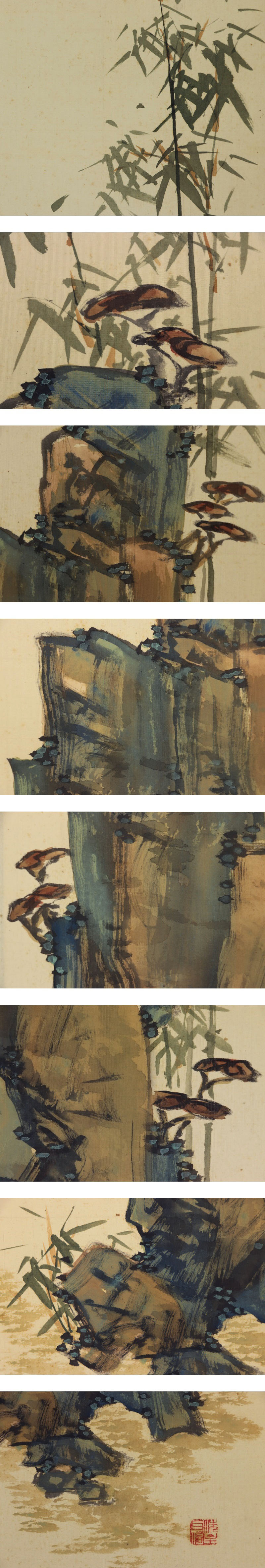 奥谷秋石 おくたに-しゅうせき(1871-1936) 日本画家。大阪生。名は常次郎。森寛斎に学ぶ。早くから橋本雅邦・川端玉章を主領とした 青年絵画協会や日本絵画協会等に出品し受賞を重ねた。 また家塾を開いて門弟の養成に尽くし、明治・大正・昭和初期の京都画壇に重きをなした。 昭和11年(1936)歿、65才。 本紙は、染み、ヤケがあります。 表装は、染み、汚れ、軸先に汚れがあります。 【サイズ】 作品 横約27.5cm×縦約128cm 表装 横約31cm×縦約197cm |
