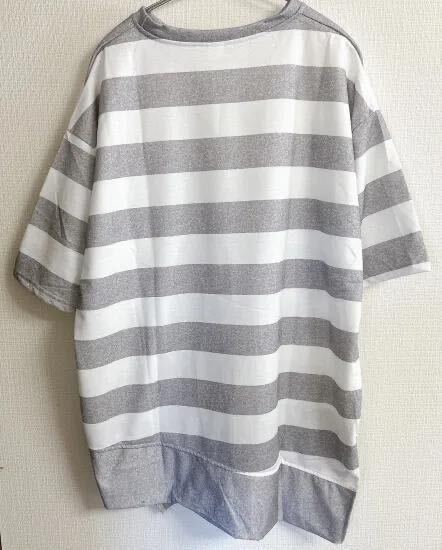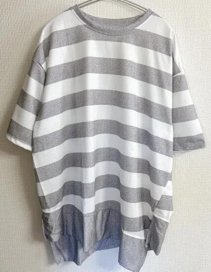 ロング丈 ボーダートップス ゆったり、ルーズTシャツ グレー 收藏