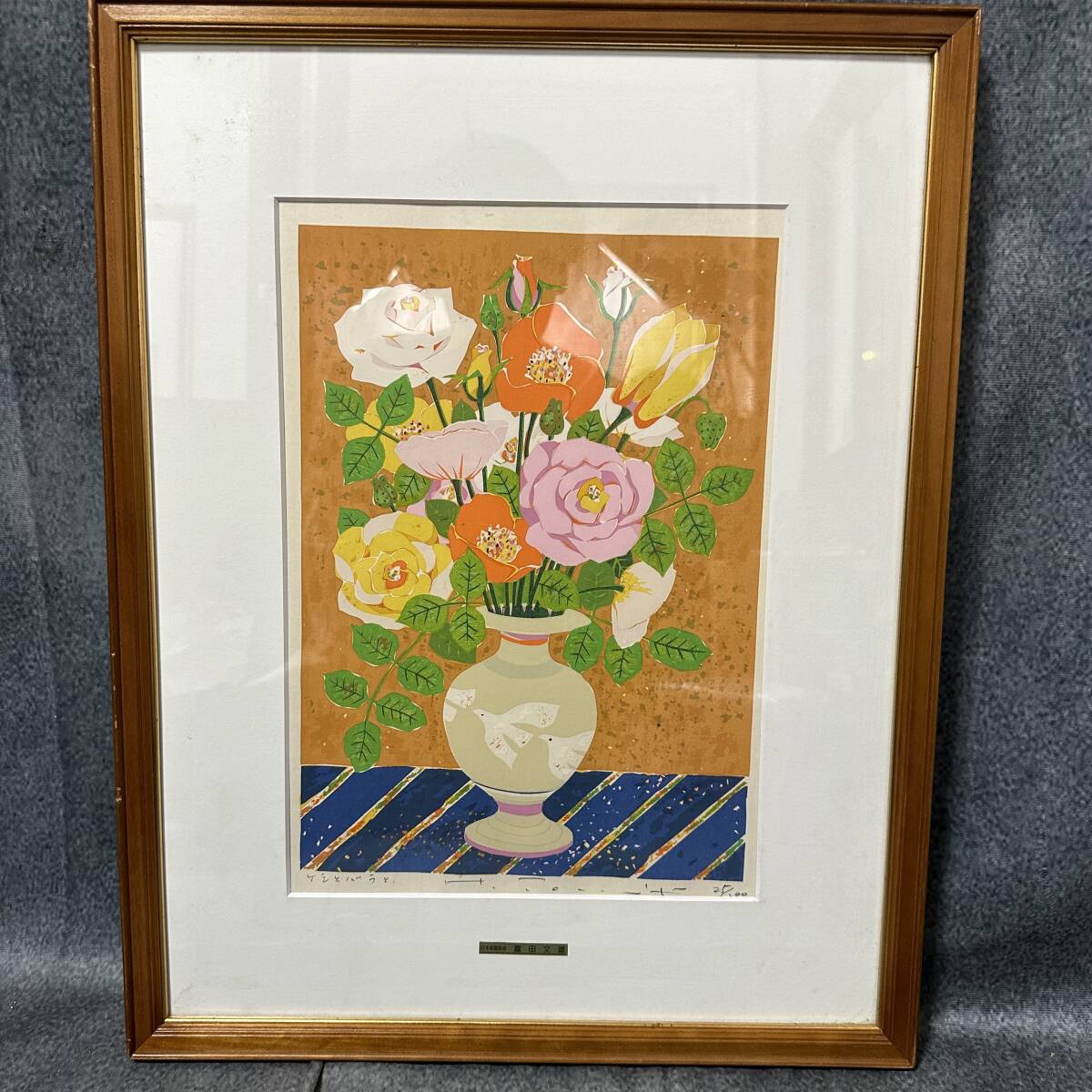 【真作】 富田 文雄「ケシとバラと」 シルクスクリーン 版画 ED 25/100 額寸 53cm x 42cm 絵画 美術品 花 静物画 (ORA-002) 收藏