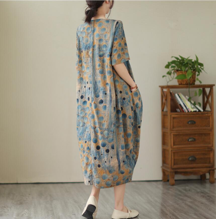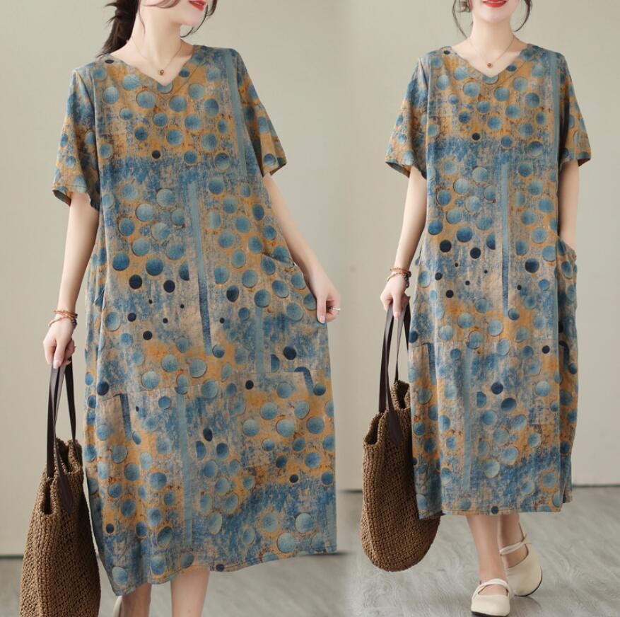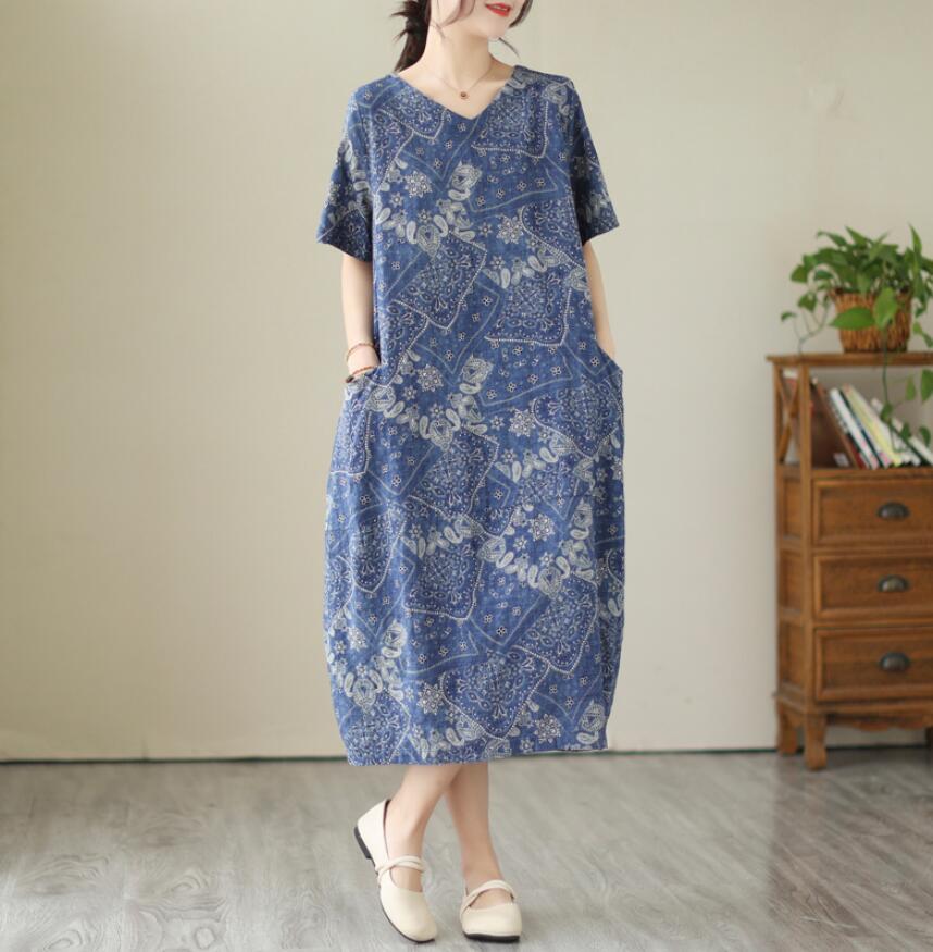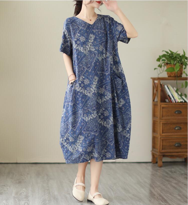 新入荷* ワンピース プリント ロングワンピース レディース 半袖 Vネック 花柄 ワンピース 体型カバー ゆったり 大きいサイズ*紺 收藏