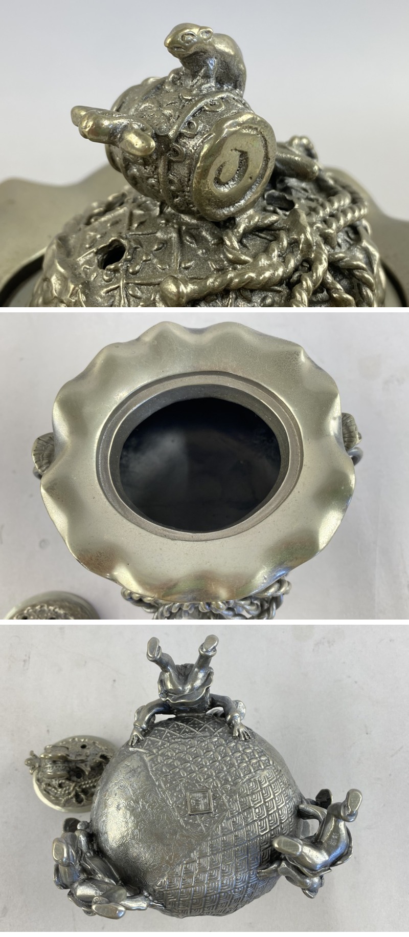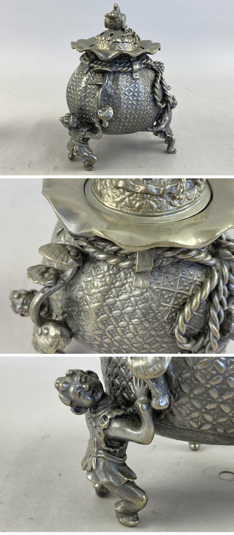 ◇商品名◇ | ac496 須賀月芳 洋銀 香炉 宝袋 砂金袋 唐子 小槌 細密彫刻 三足 蝋型 銅の炎 香爐 茶道具 香道具 高岡銅器 | ||||||||||||||||||||||||||||||