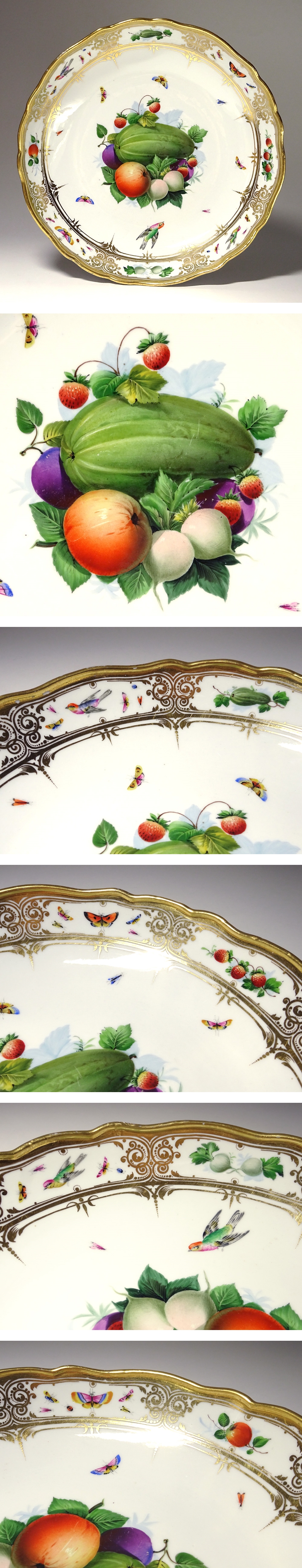 慶應◆19-20世紀初頭頃【Meissen オールドマイセン】金彩装飾 ハンドペイントフルーツ鳥蝶文飾皿 深皿 キャビネットプレート 直径27.8cm 收藏