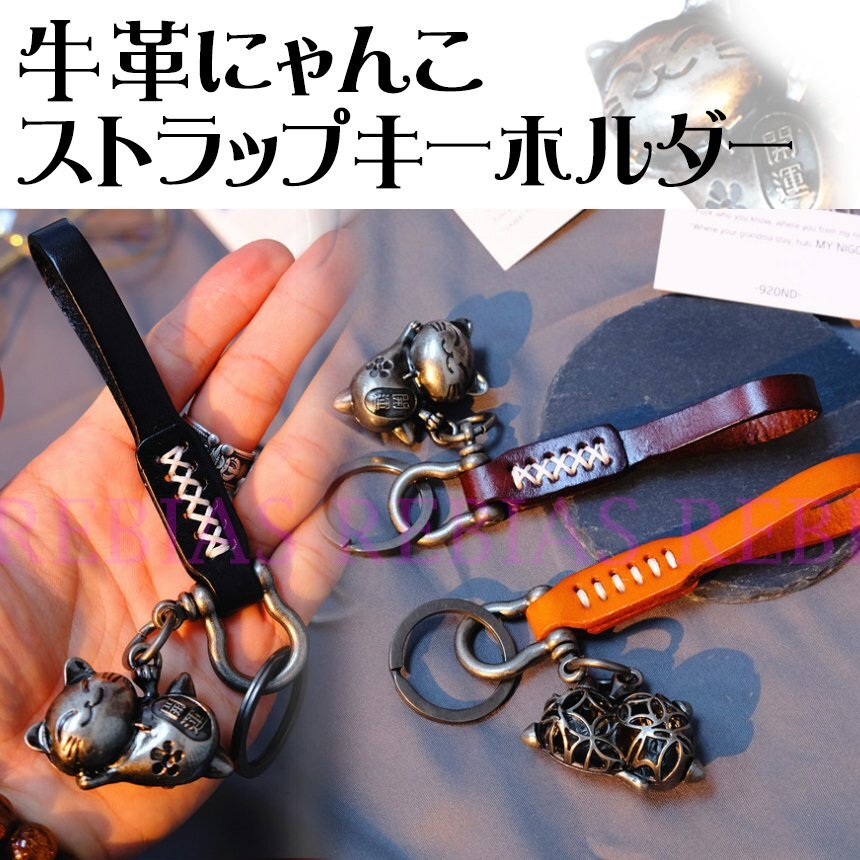 送料無料 【オレンジ】 牛革 にゃんこ ストラップ キーホルダー 猫 招き猫 キーチェーン レザー 收藏