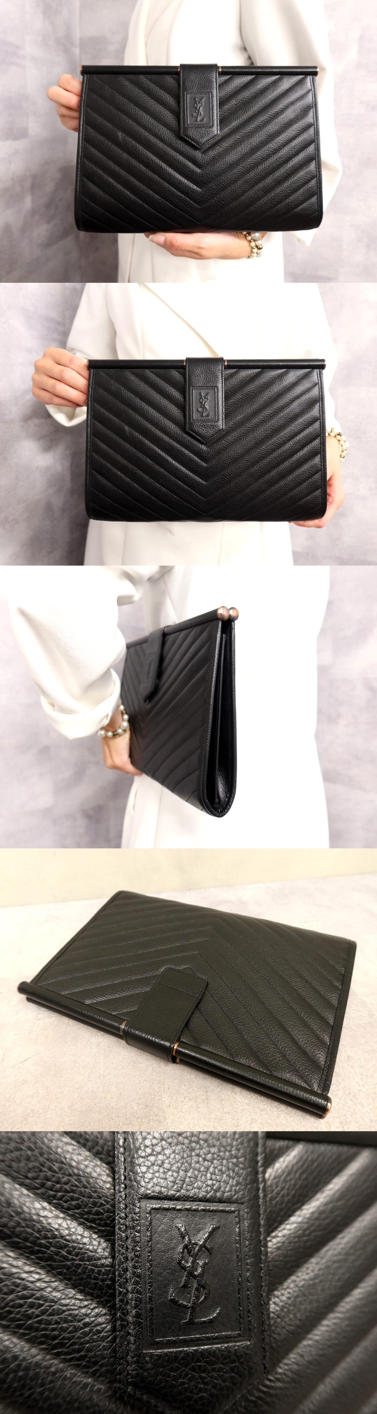 ●超美品●YSL Yves Saint-Laurent イヴ・サンローラン●Vステッチ●カーフ レザー 本革●セカンド クラッチ バッグ●黒●G金具●Js61966 收藏
