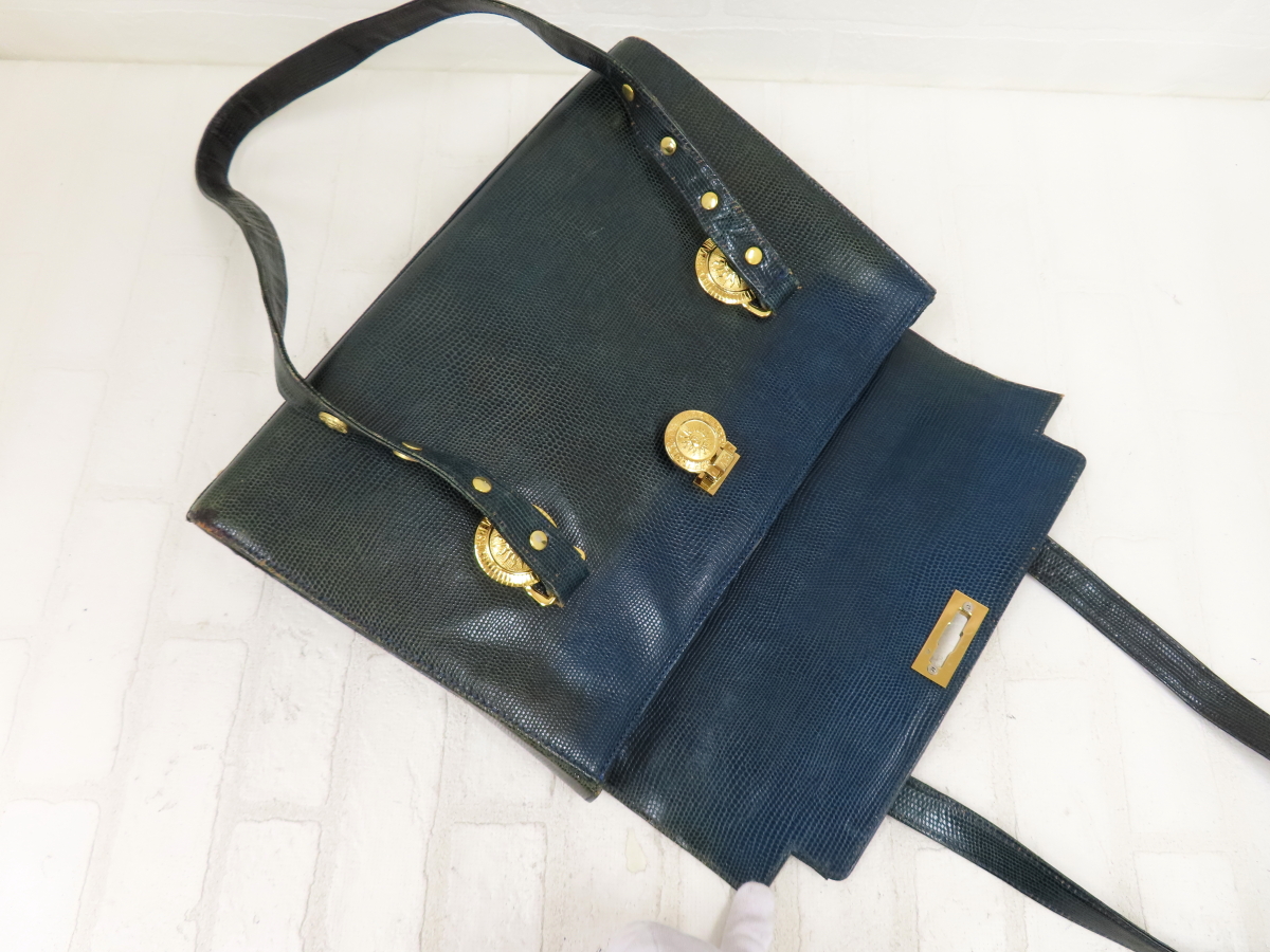 ◆GIANNI VERSACE ジャンニ・ヴェルサーチ◆サンバースト◆リザード型押し レザー 本革◆ショルダー バッグ◆緑 G金具◆太陽神◆A14159 收藏