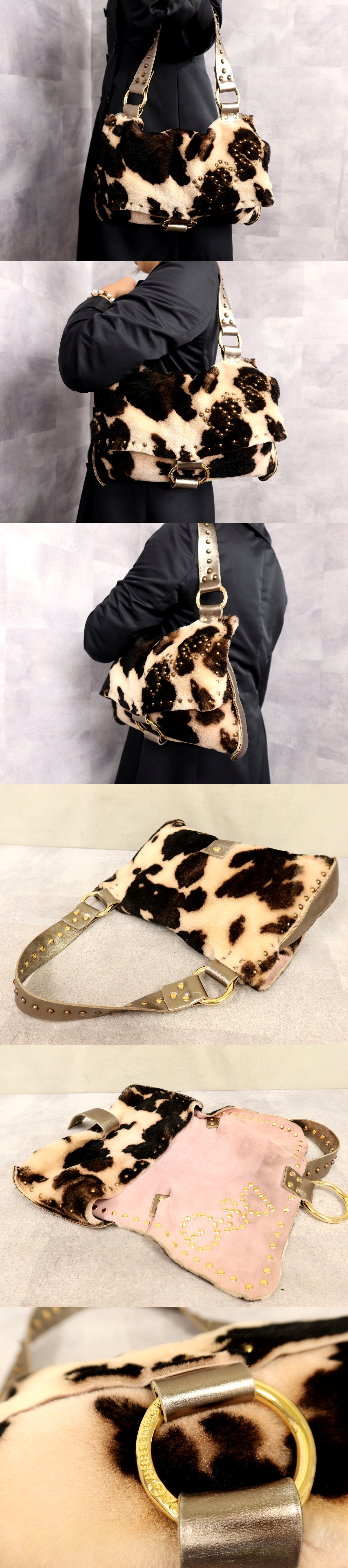 超美品●Dolce&Gabbana ドルチェ&ガッバーナ●スタッズ●ファー カーフ レザー 本革●ショルダー バッグ●茶系 メタリック●G金具●Js62351 收藏