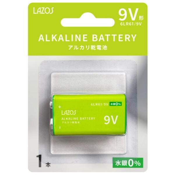 LAZOS製 9V形 (006P形) アルカリ 乾電池 1本