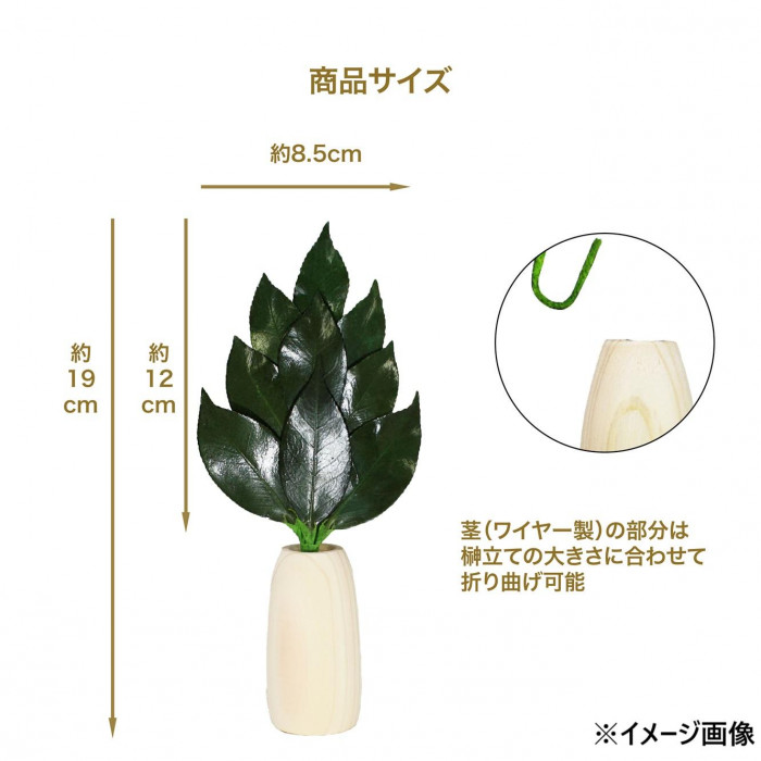 | プリザーブド榊と高級なヒノキの丸い榊立てセットです。榊の茎(ワイヤー製)は、榊立ての大きさに合わせて折り曲げ可能です。 |