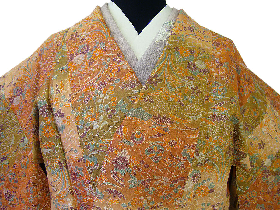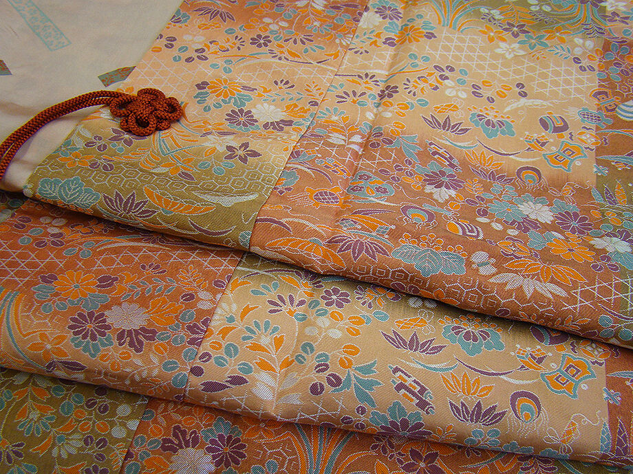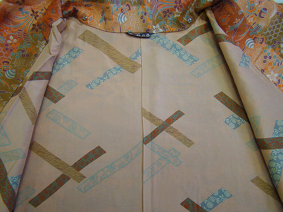 | 商品説明 | 大変にしなやかなしっかりとした重めの手触りの極上の着心地を誘う 贅沢にも重厚感際立つ重めの上質な能衣裳の生地の道中着。 しし色、甚三紅色、渋いキャメル色地に花草、宝尽し柄等の織柄。 お洒落な肩裏も正絹。 手縫い仕立。 |