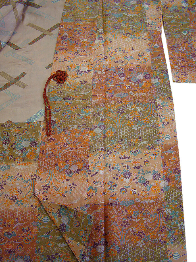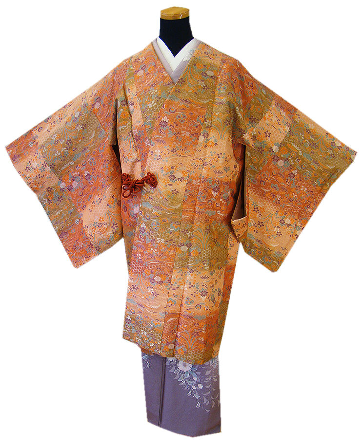 | ちょっと一言 | 能衣裳とは五百年の歴史を誇る室町時代に花開いた能の舞台に使用した衣装のことです。 通好みな技法に洗練された極め細やかな精緻な手技を駆使した上質な能衣裳の道中着です。 ワンランク上のコートを羽織、周りに差をつけ趣向を凝らした纏う度に心躍る完好なお品です。 着る方、見る方を夢幻の境地に誘う重厚感際立つ能衣裳は、着物上級者の着こなしでしょう。 極上生地に色とりどりの色調が生み出す洗練の美を末永くご堪能下さいませ。 |