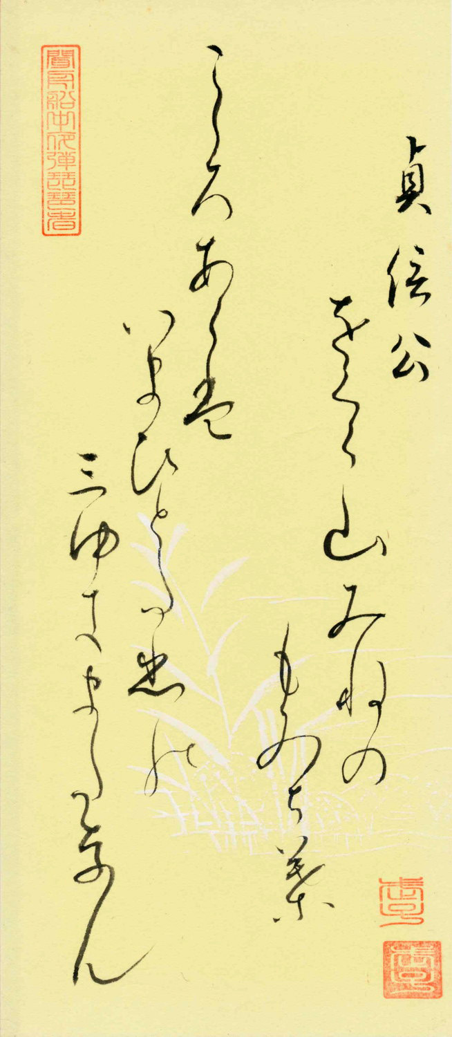 伊達孝子(たかこ)の和歌は「ちらし書」と呼ばれる書法です。文字を散らして布置するわが国独自の書き方です。この書法の歴史は平安時代の康保3年(967)の「紙背仮名消息」(滋賀・石山寺)、同じく平安時代の公卿・藤原公任(きんとう)自筆『北山抄』「仮名消息」(京都国立博物館)が知られております。各行に高低の変化をつけ、流暢(りゅうちょう)に続く連綿はきわめて美しいもので「百人一首」の書法として平安時代の公卿卿などの間で広まり、その後大名家の姫君の間で用いられておりました。
