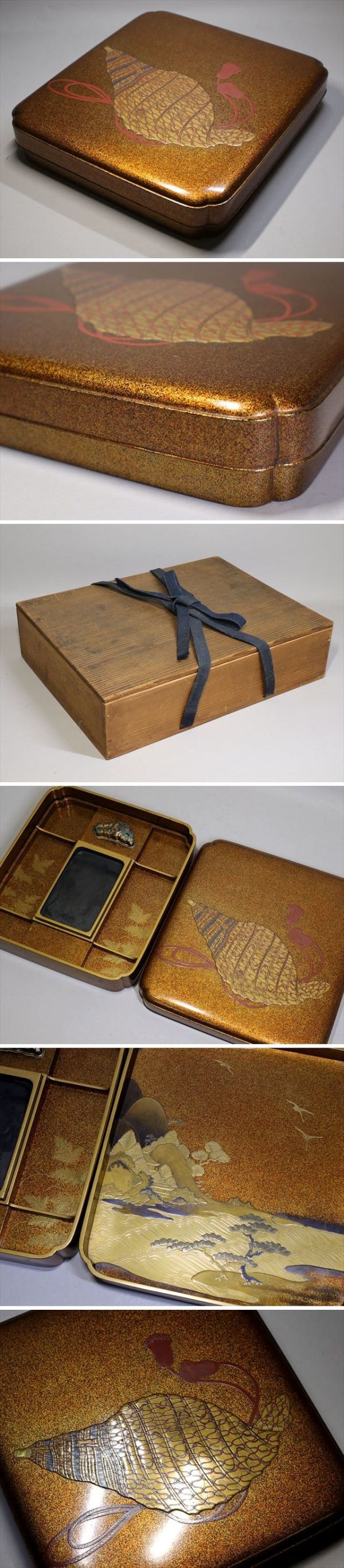 洗練された見事な出来栄えの作品です。総金梨子地に立体的な法螺貝の蒔絵が細かい所までとても丁寧に描かれています。内側には繊細な楼閣山水図の蒔絵が施されており、凛とした美しさを感じる素晴らしい出来栄えです。古作にため、直しや経年のいたみはありますが全体的には大変良好です。多くの時間と手間をかけて仕上げられた作品です
