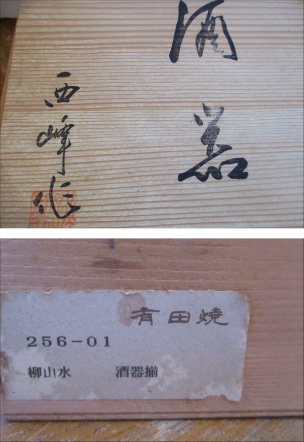 | ご覧いただき、ありがとうございます。 【未使用・旧家蔵出・レア】 有田焼 染付 柳山水 徳利2本&おちょこ5個 酒器揃 在銘あり 酒器セットの出品です。 旧家で木箱に入った状態で保管しておりました。 染付の美しい紋様の徳利&おちょこのセットになります。 棚に飾っておくだけでも素敵です☆ 在銘がございますが詳細は不明です。 あまり見かけないお品だと思いますので、この機会にぜひ! ※専用の木箱は経年ダメージが大きくございますので、箱なしでの発送とさせていただきます。ご了承くださいませ。 【サイズ・約】 徳利:幅最大 8.5cm 口径 3cm 高さ 12.5cm おちょこ:口径 5.7cm 高さ 4.3cm (おおよそのサイズです。素人の採寸ですので若干の誤差はお許しください。) 【状態】 未使用品です。 自宅での長期保管品になります。 製造時からの陶器製品特有のざらつき、釉薬ムラが若干ございます。 特に大きく目立つ傷や破損もなく状態は良好です。 未使用品ですが、長期保管品、一度人の手に渡ったものになりますので、完品をお求めの方、細かな点が気になる方はご入札をお控えくださいませ。 ※専用の木箱は経年ダメージが大きくございますので、箱なしでの発送とさせていただきます。ご了承くださいませ。 丁寧に梱包して発送致します。 詳細は写真をご覧の上ご判断ください。 画像に写るグリーンの球体(直径11cm)は商品には含まれません。 最終日のご質問には回答が間に合わない場合もございます。ご理解くださいませ。 | |||