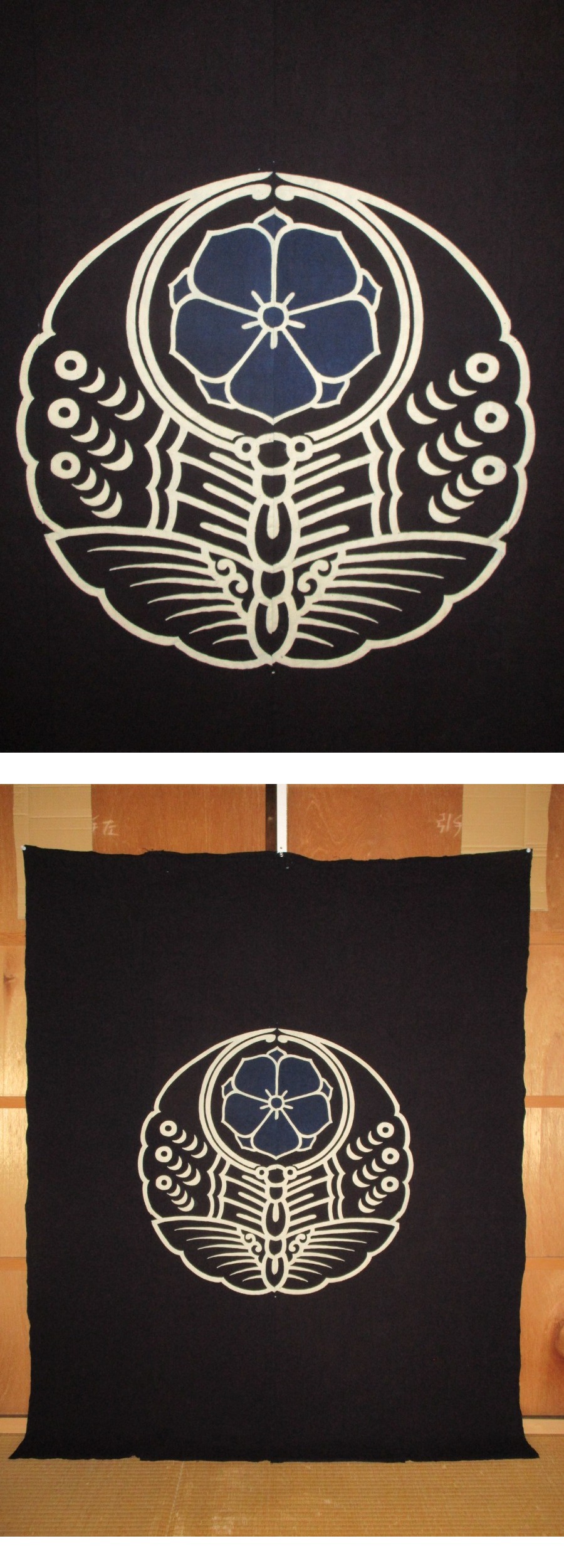 【昔古布】大正期 無傷で 美品 厚手の 藍染木綿 筒描 4幅 (長162) ●浮線蝶に剣片喰● リメイク材料 收藏