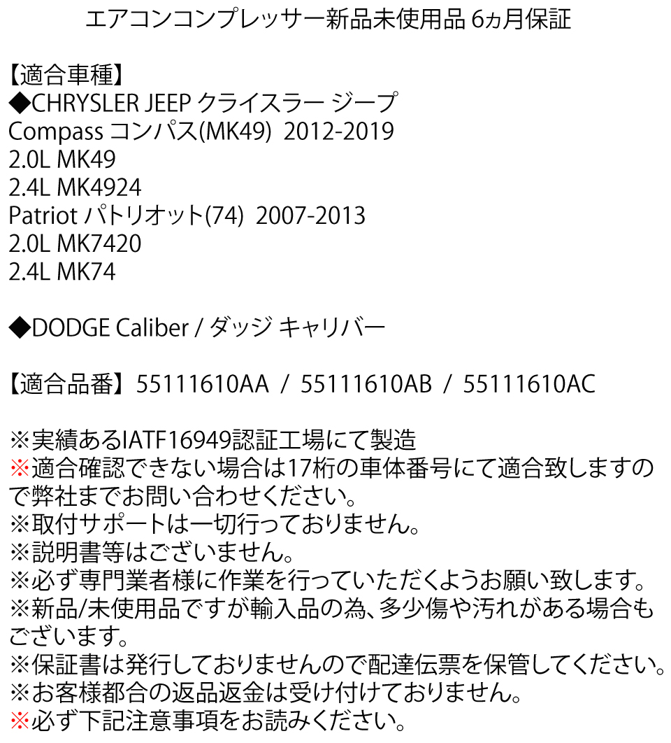 | 商品名 | クライスラー ジープ コンパス 2.0L MK49 パトリオット 2.4L MK74 エアコン コンプレッサー 55111610AA 55111610AB AC コア不要 エアコンコンプレッサー |