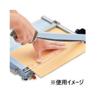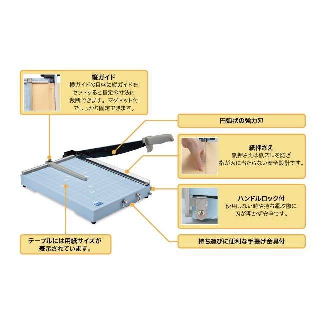 | 金属製ボディーで耐久性抜群。持ち運びに便利な手提げ金具付。足ゴム付。縦ガイド付(マグネット付)。紙押さえ付。ハンドルロック付。テーブルには各規格用紙サイズが表示されています。 |