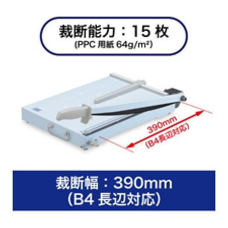 | 仕様 | 裁断幅:390mm(B4判) 裁断能力:15枚(PPC用紙) テーブルサイズ:W307×D425mm |
