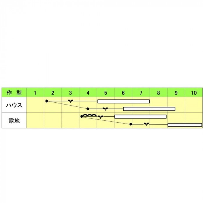| べと病に対して強い抵抗性を持っています。草姿立性で草丈が高く、生育旺盛で収量性も優れる。抽苔が遅く、長期収穫できます。 【栽培のポイント】 ・栽培方法は通常のスイートバジル栽培に準じる。 ・遅霜の心配がなくなってから9cmポットまたは128穴セルトレイに播種する。 ・バジルは好光性種子(発芽に光が必要)のため、覆土は浅めとする。 ・本葉6枚(3節目展開)時に定植する。(播種後25~30日頃) ・乾燥に弱いため、水を切らさないよう注意する。 ・本葉12枚頃(5~7節)に頂芽を摘心して、側枝が伸びるようにする。 ・7月頃から花芽が着き始めるので早期に摘み取る。 ・花芽が着いたまま放っておくと養分を奪われ、葉が硬く小さくなり、香りも弱まる。 ・定植後は株の状態を見ながら適宜、即効性の液肥を施し、草勢を維持する。 ・元肥は10aあたり、苦土石灰100kg、完熟堆肥2t、窒素成分で10~15kg程度、畝間100~120cm、株間30~50cmの2条植えを基本とする。 【注意事項】 ※種子は播種後の栽培条件、天候事情により、その結果が異なる場合がございます。 万が一、結果不良でも保証はできかねます。 |