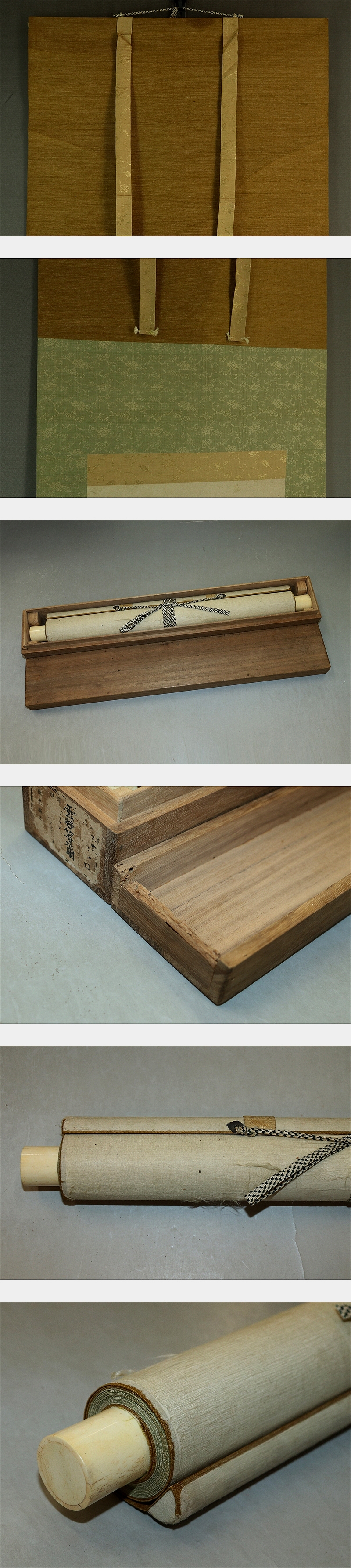 雲谷等爾 うんこく-とうじ (1615-1671) 江戸時代前期の画家。元和(げんな)元年生まれ。雲谷等益の次男。 明暦元年兄の等与とともに御所の障壁画制作にくわわった。寛文11年死去。57歳。 本紙は、染み、汚れ、強めの折れ、皺、虫食、擦れがあります。 表装は、軽い染み、薄汚れ、折れ、皺、虫食、破れ、ほつれ、剥がれ、 軸先に汚れと傷み、箱に虫食いがあります。 【サイズ】 作品 横約27cm×縦約109cm 表装 横約39.5cm×縦約196cm |