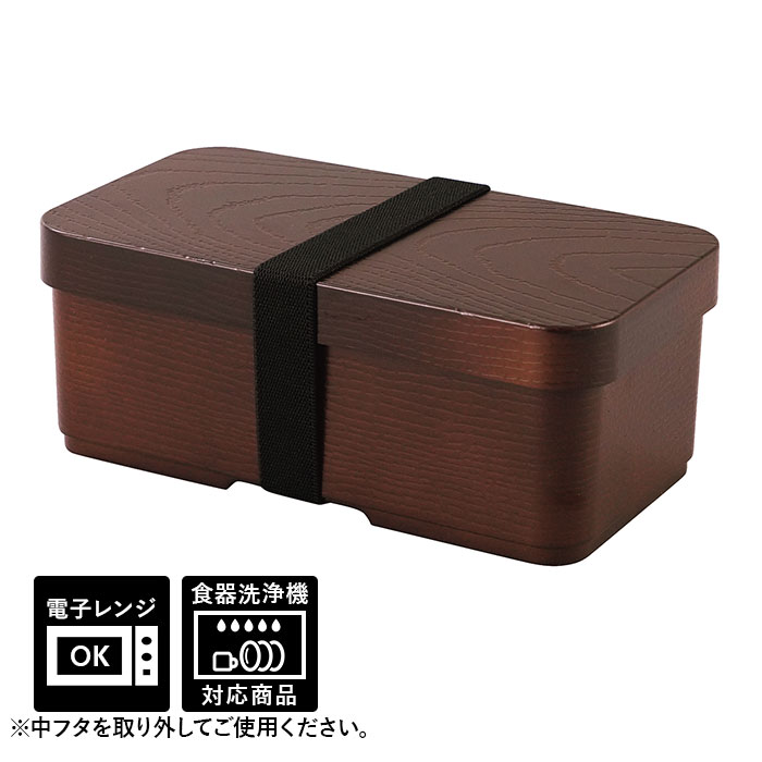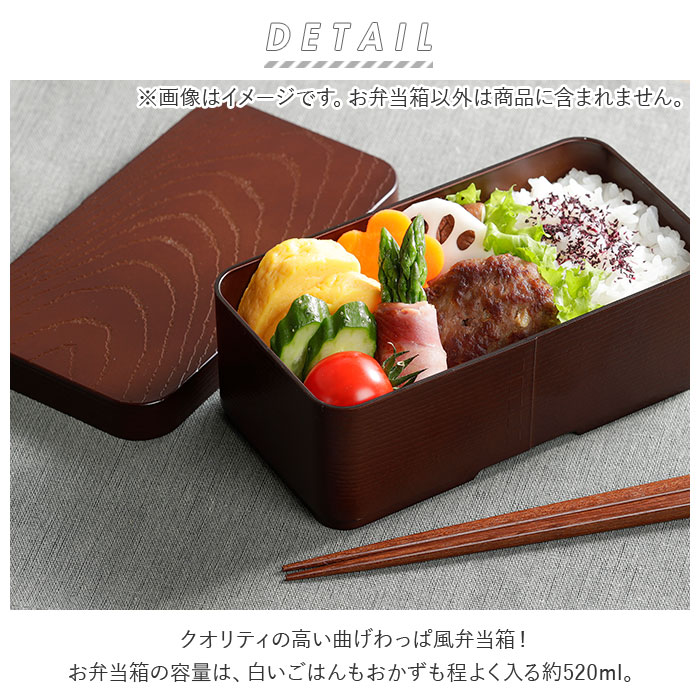 | 商品説明 | ・・シックで高級感がある!クオリティの高い曲げわっぱ風弁当箱! ・お弁当箱の容量は、白いごはんもおかずも程よく入る、ダイエット中の方やOLさんのランチにちょうどいい約520ml。 ・使い勝手のよいシンプルな角型に、飽きのこない木目調デザインで、オフィスや学校でのランチタイムにぴったり。 ・曲げわっぱ風のレトロな見た目なのに、家庭用電子レンジでの温めや、食器洗い洗浄機の使用もOK!お手入れがとってもラクチン。(※中蓋は電子レンジや食器洗い乾燥機でご使用いただけません。取り外してご使用ください。) ・中蓋付きで汁漏れしにくく安心♪ ・ランチボックスをしっかりホールドして、持ち運び時に便利なランチバンドが付属。 ・ |