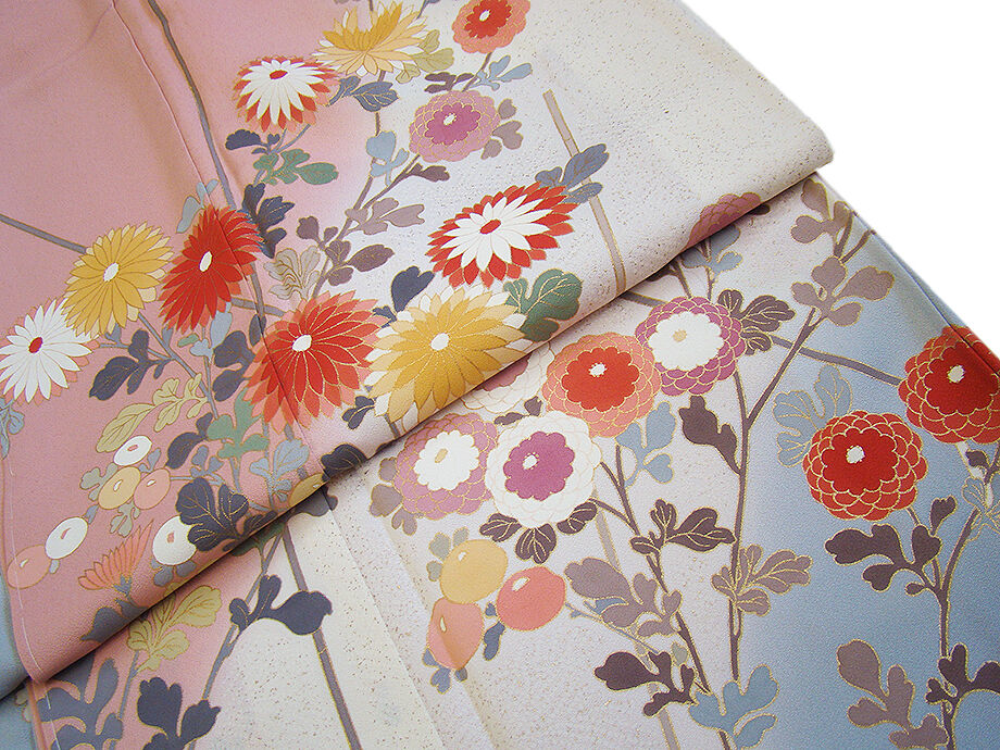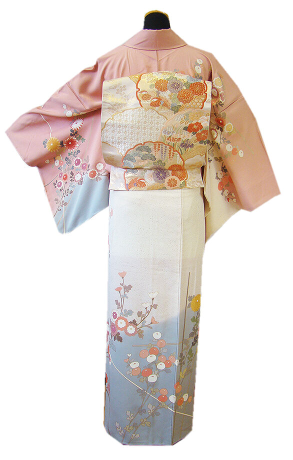 | 商品説明 | こちらのお品は袷でございますので、10月~5月までお召頂ければと思います。 しなやかな手触りの着心地良いさらりとした滑らかな重めの極上ちりめん地の生地、 珊瑚色、灰青色、象牙色の三色ぼかし染に花草柄の染柄に豪華な金彩加工仕立て、 八掛は共布に柄入り(正絹)、幅広い年代の方にお召し頂けます。 しなやかな扱い易く〆易い西新織の袋帯(六通柄)は、 豪華な金糸や多色の色彩の雪輪文、四季の花木、水鳥、七宝文等の織柄が 日本情緒に満ちた重厚感ある帯姿を演出しております。 帯揚げはちりめん地、ピンク色地に橙色ぼかしに花の地模様入り、 帯〆は平組、銀朱色の組紐となっております。 |