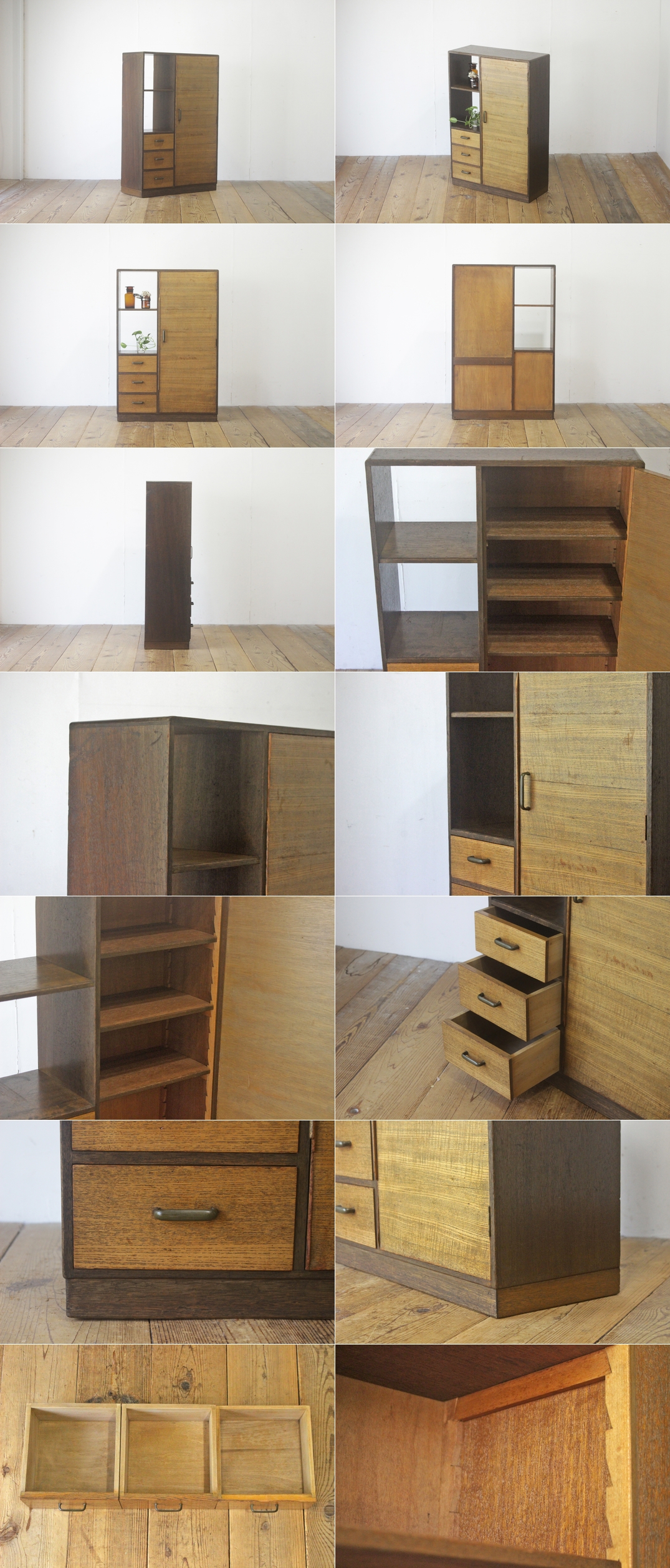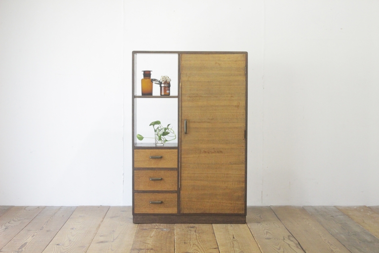 レトロ 小振り キャビネット 戸棚 引き出し 抽斗 3杯 収納 ラック 左右非対称 木製 ヴィンテージ/昭和アンティーク/PGT15114 收藏