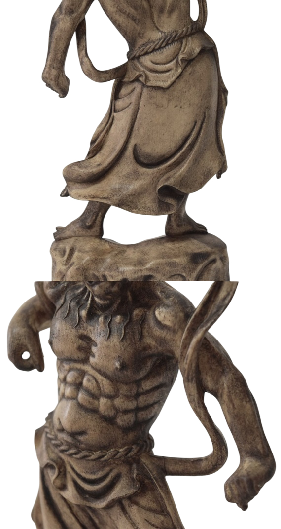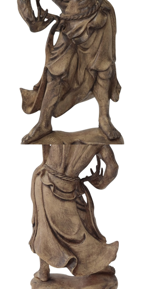 高さ約29cmと大き目の仁王像です。 約20cmと比べて迫力が大分違うので迫力が欲しい方はこちらがおすすめです。 寺などの守護者などの役割で入り口近くに配置される金剛力士像 悪を断ち切る使命や「仁王立ち」で守護することから仏像好きにも愛されています。 サイズ:高さ:約29.3cm 左像の下辺の横:約13.1cm 右像の下辺の横:約12.2cm 厚み 約6.5~7.5cm 彫り:手彫り&機械彫り 素材:桧木 *手作業にてムラ染めを行っているため、一体一体染まり方が違いますのでオンリーワンの仏像を楽しむことができます。また経年によるかっこいい雰囲気を出すために傷加工を施していますのでアンティーク仏像が好きな方におすすめです |
